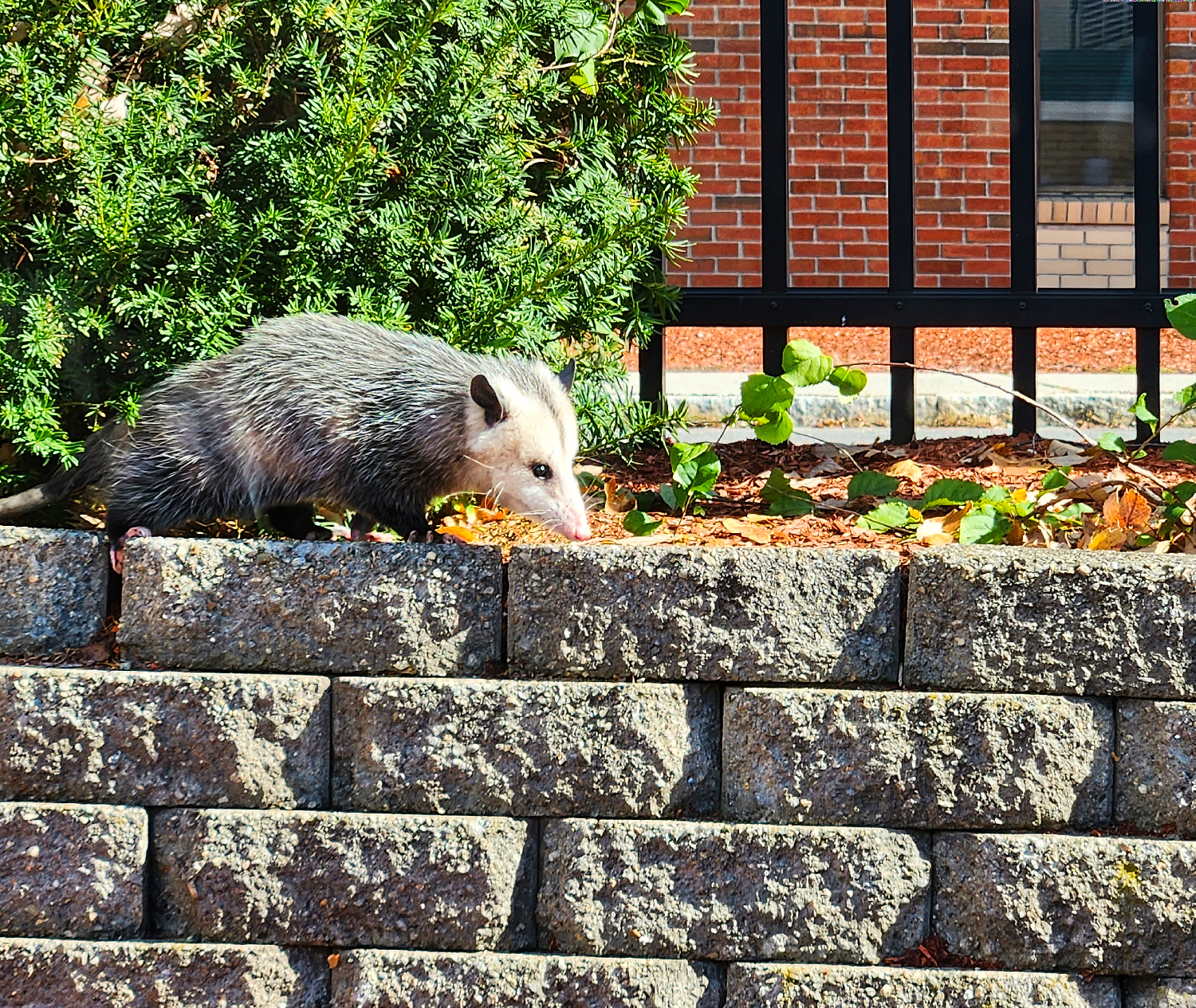 This opossum was working on balance while pacing along the top of this wall. Nashua, NH. (C) 1inawesomewonder.com 2023.
