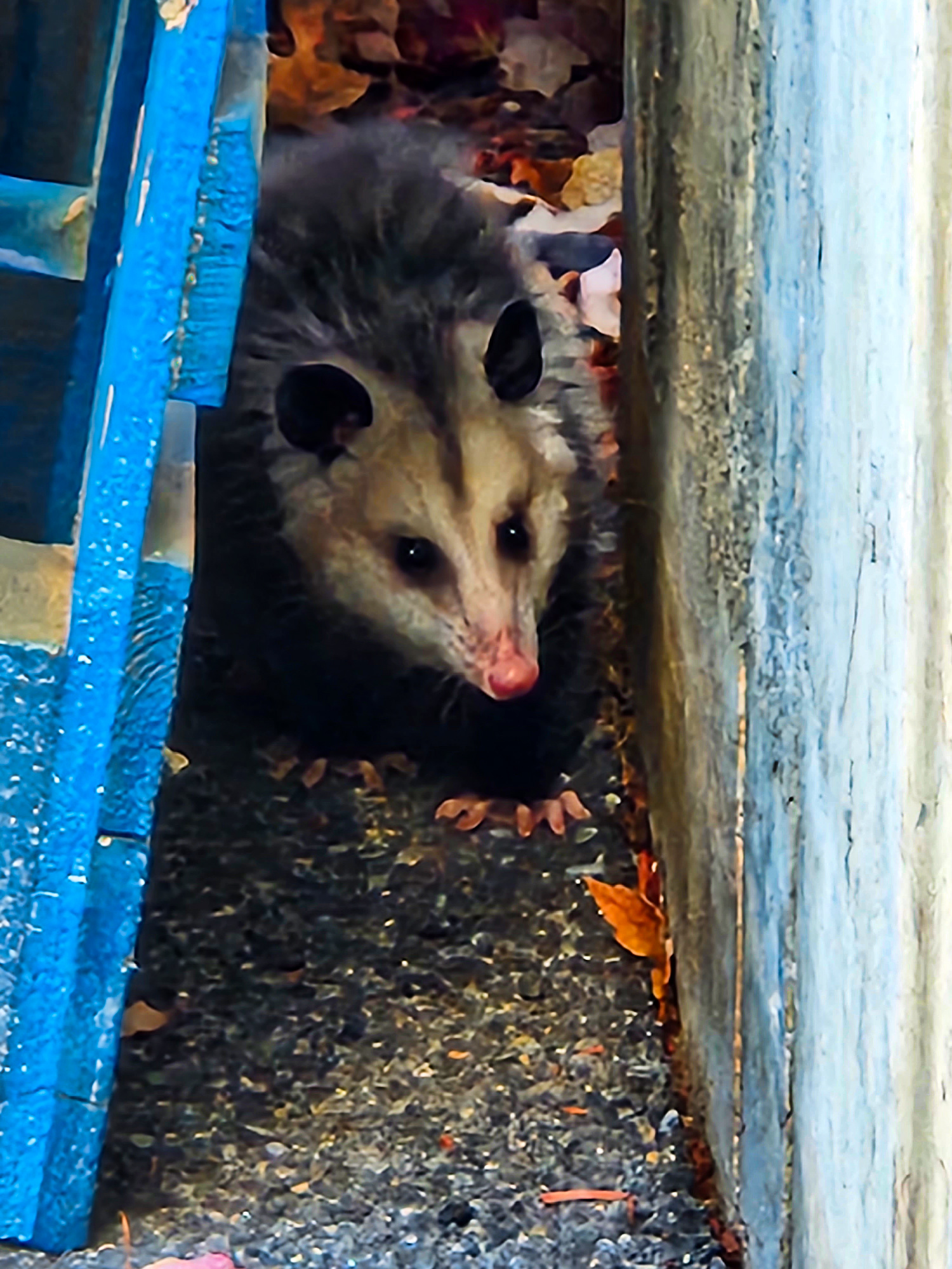 Same opossum, but now it was avoiding traffic coming and going from the loading docks at Southern NH Medical Center in Nashua, NH. It got away unharmed. (C) 1inawesomewonder.com 2023.