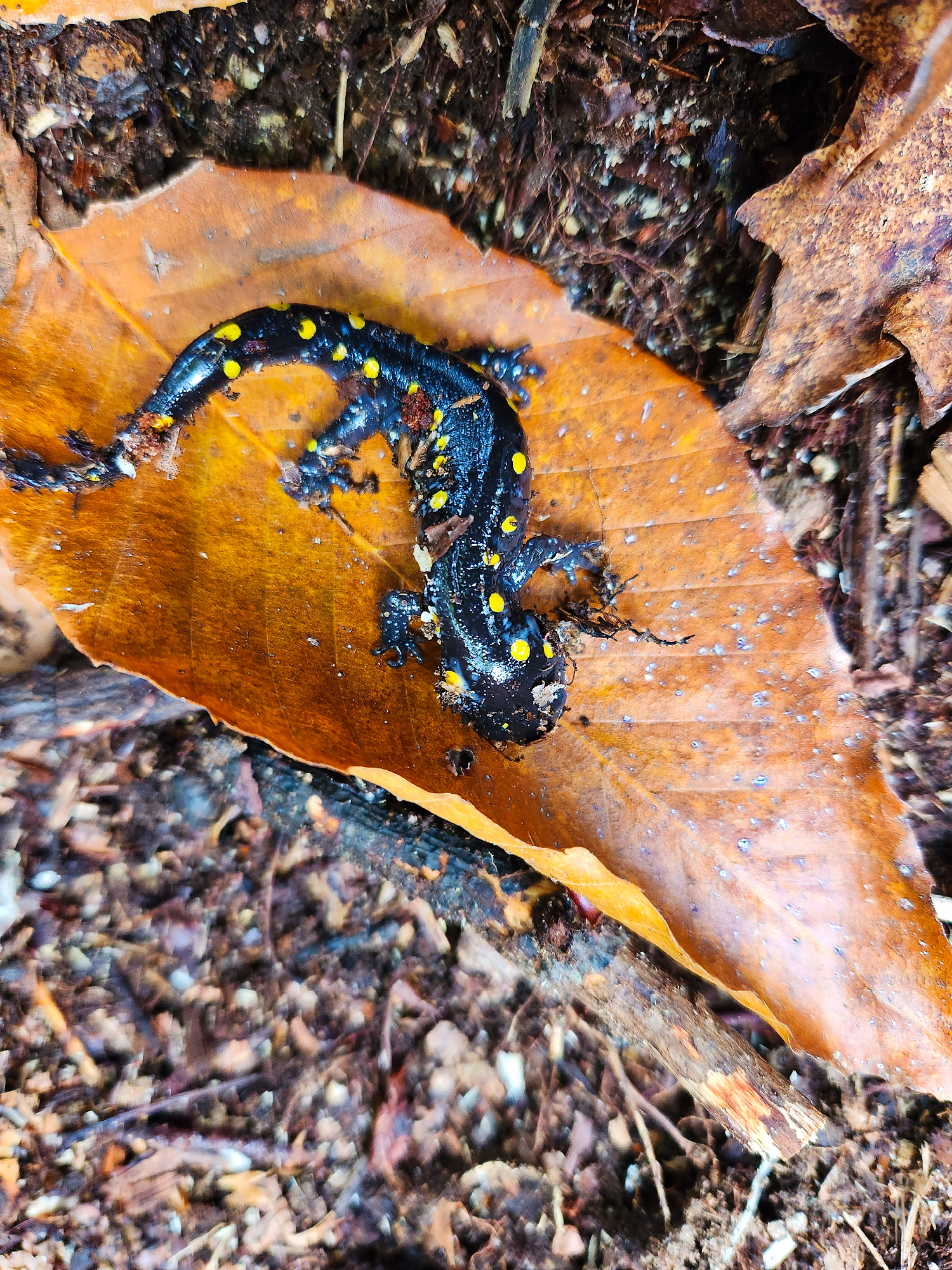 I found this little spotted salamander while cutting wood along Black Brook. It looked to be in rough shape. I put some water in this leaf and the salamander did drink. Then, after a while it wandered away. (C) 1inawesomewonder.com 2023.