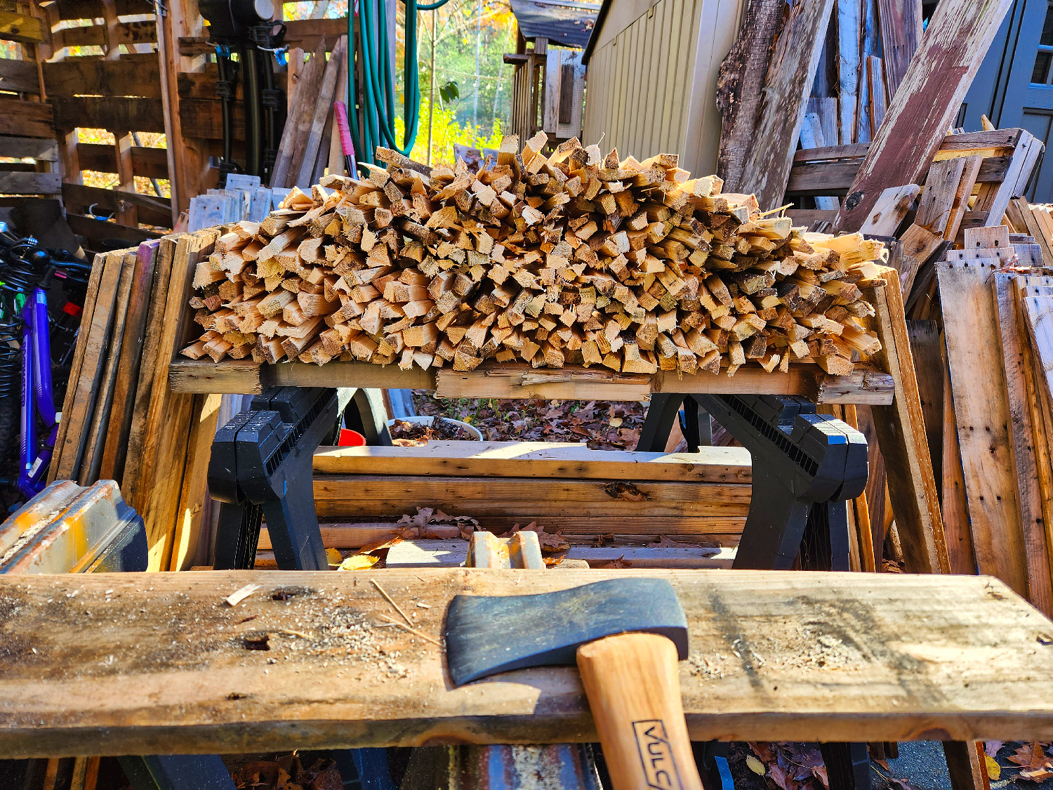 Turning big pine rounds into 15 lb. bags of dry kindling wood. (C) 1inawesomewonder.com 2023.
