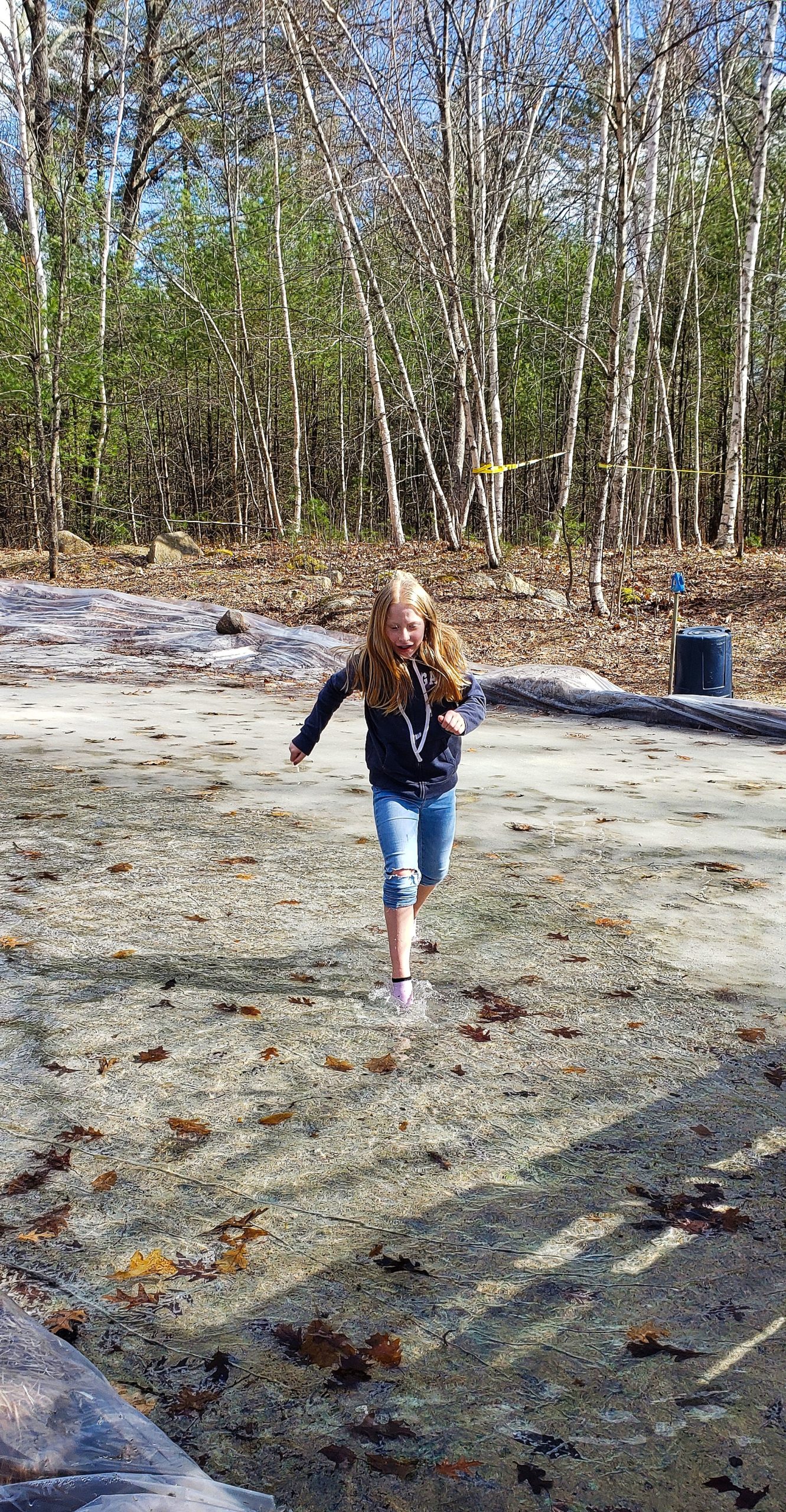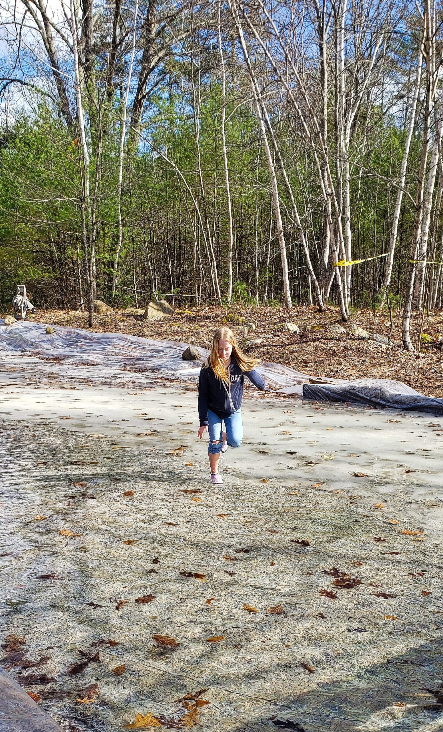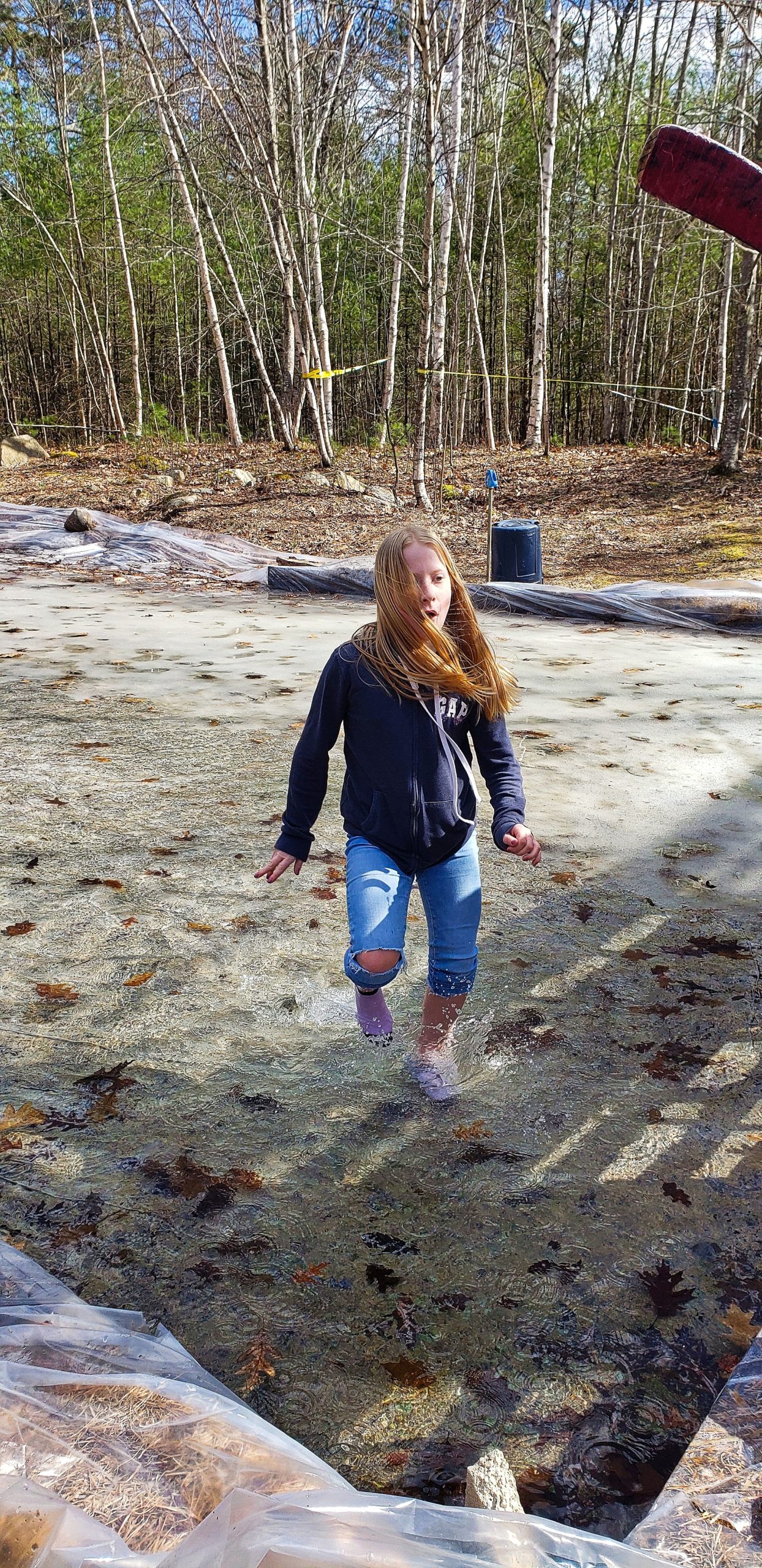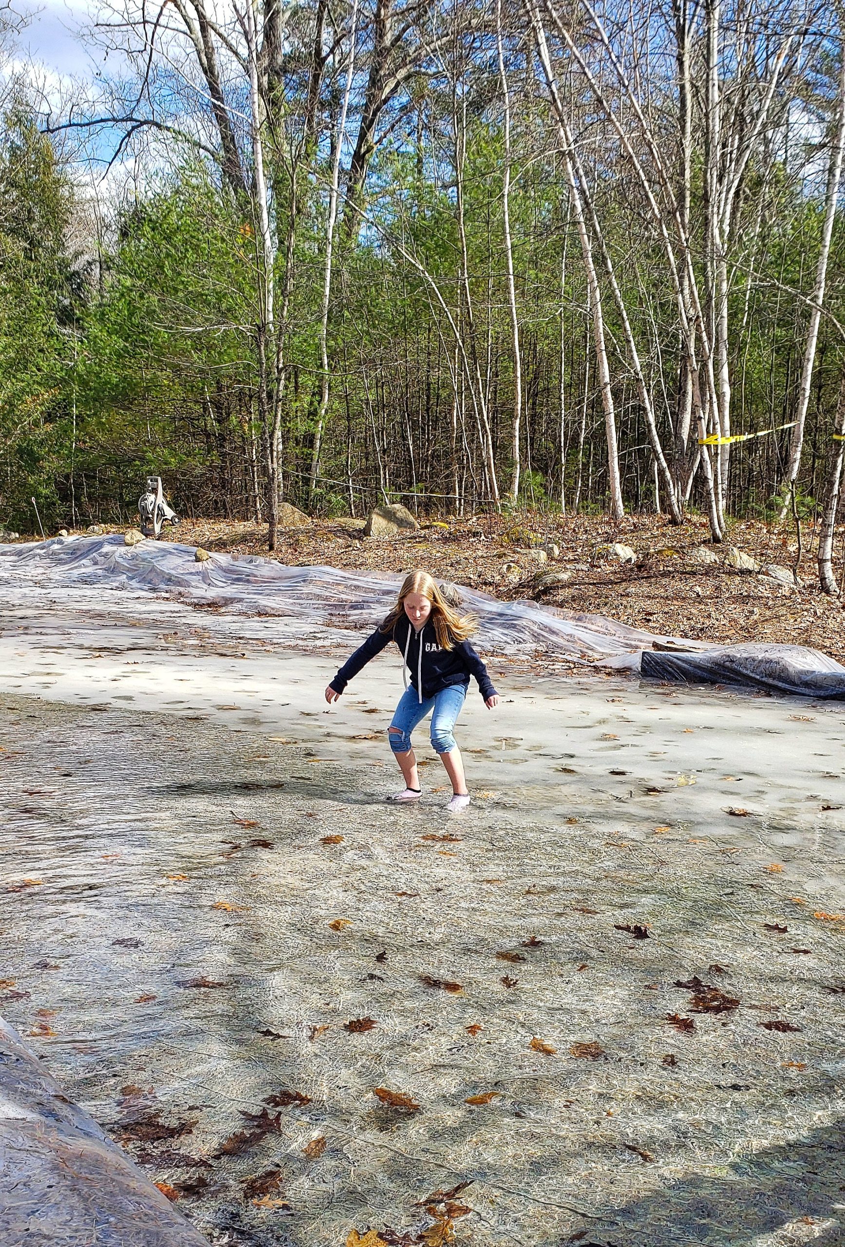 It was a nice, sunny, pre-spring day with the temperature nearly at 60F. Our daughter was enticed by the shallow pool of water, as she was looking for a way to cool off. She did cool off alright. She took to the water… for about 30 seconds. After the quick soaking of her feet and ankles, she threw her socks off and spent some time on the home made swing set right near the rink area. Her feet dried and warmed quickly, and all ended well.