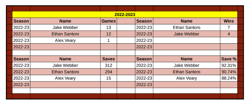 - Goalies, Jake Webber, Ethan Santoro, and Alex Veary all played well in their December appearances. They made 160 saves in the five games.