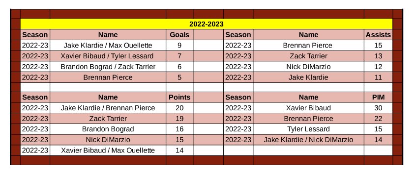 - This team was truly a team by definition, because it required everyone to get the results they achieved. Jake Klardie and Max Ouellette led the team in goals scored, with 9 each.