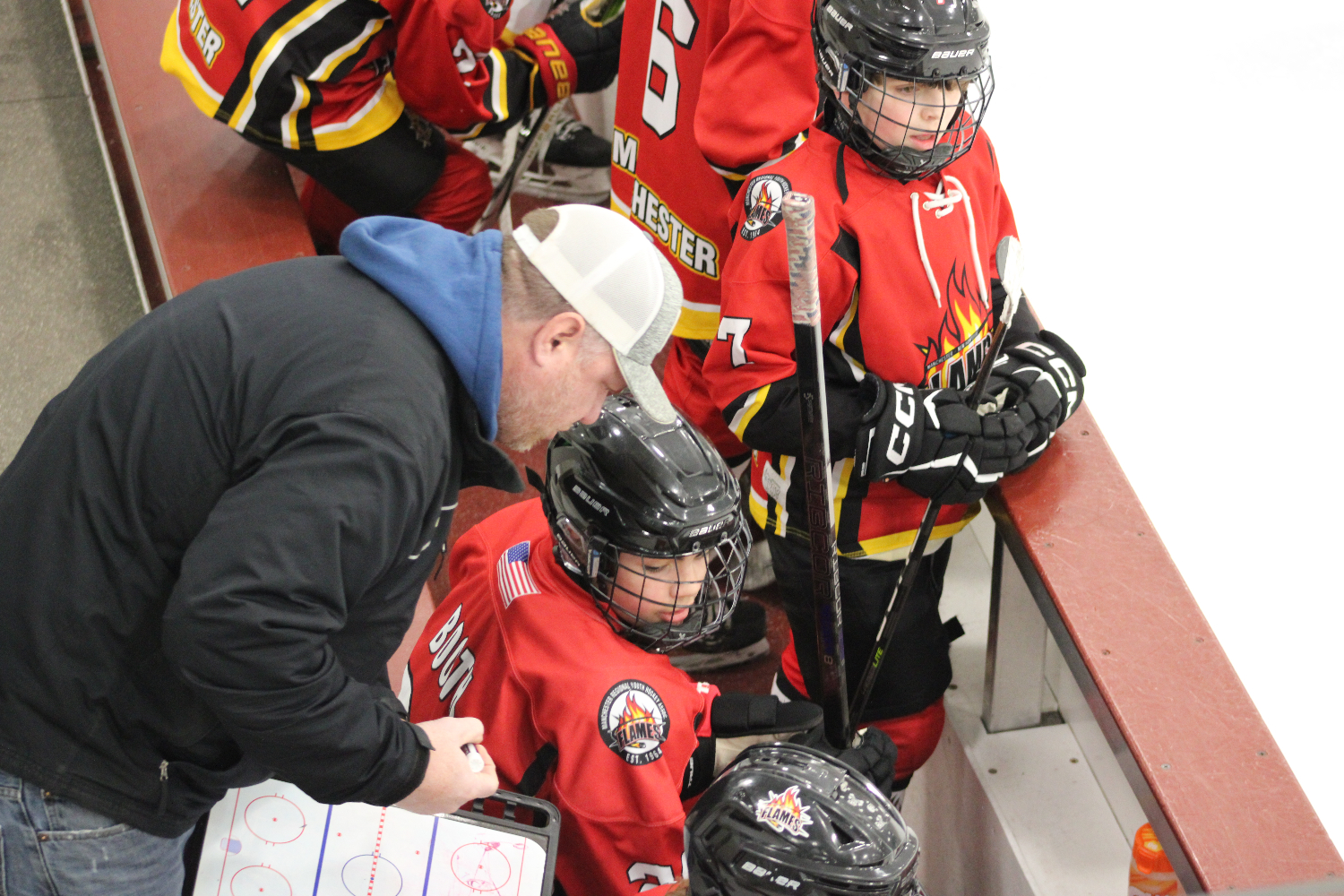Coach Tim draws up some could be’s and should be’s for the boys on the bench. Gavin is in a day dream, pondering where to rate his lunch on a scale of Top 50 lunches during the season. Side note: There was a citation written up for this photo as the Governor’s deemed that the drone had flown “a tad too close” to the players. Great shot though. (Photo by Mooney’s Moonshots)