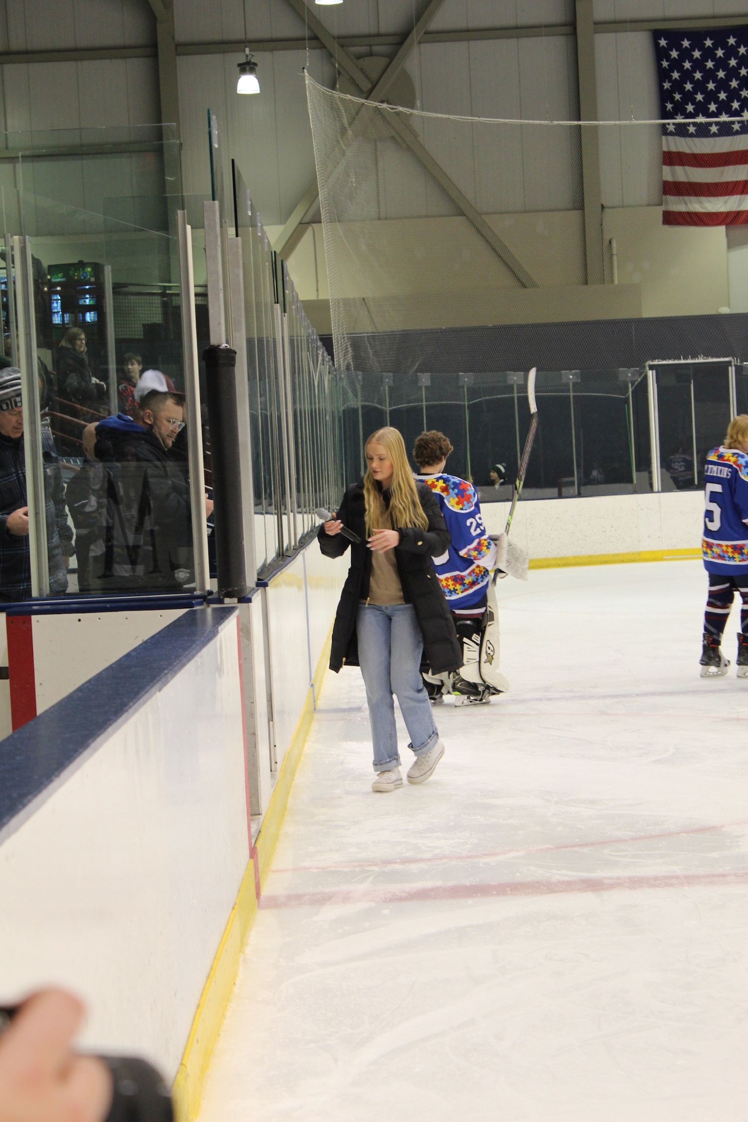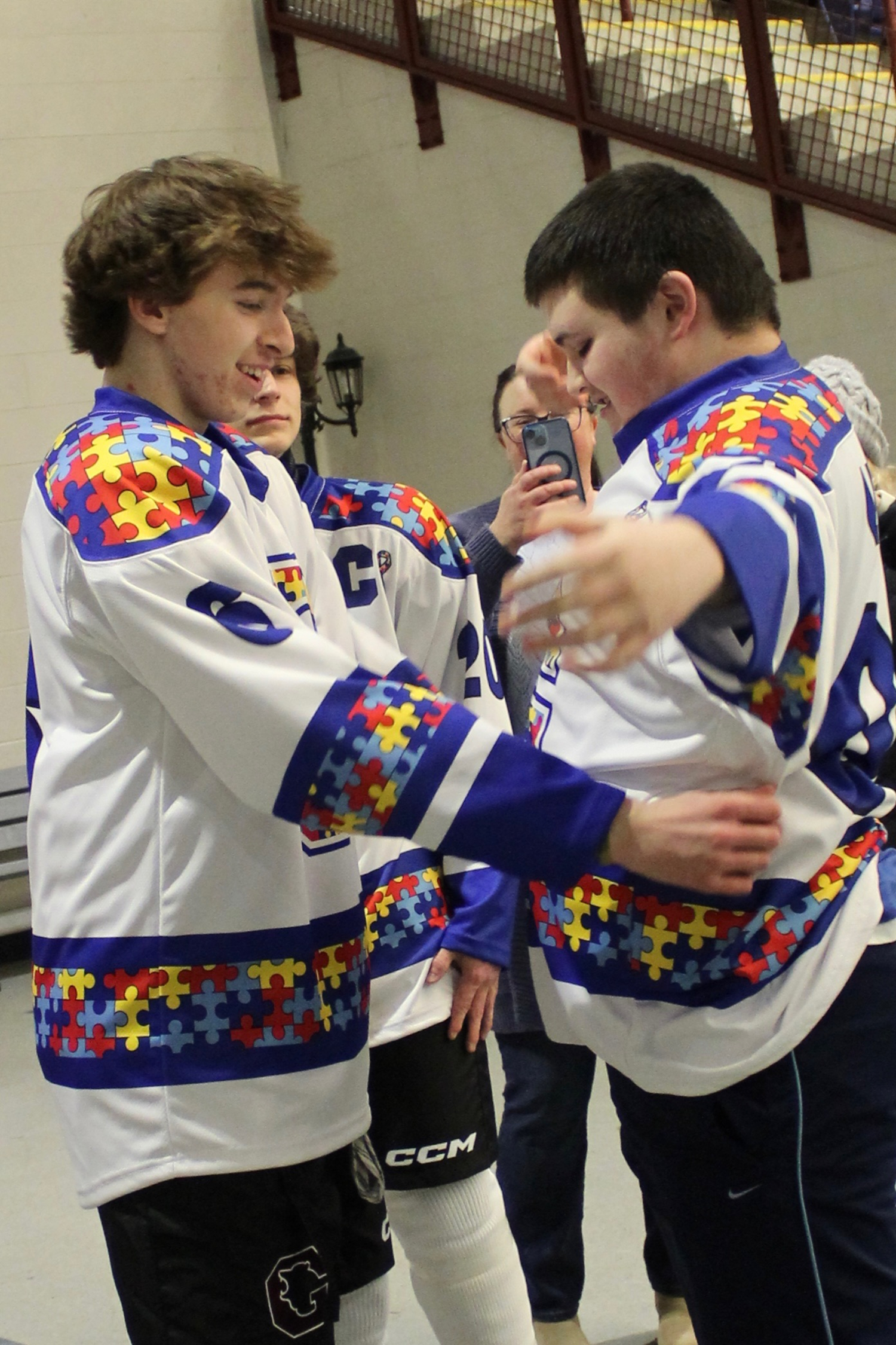 Goffstown hockey, Alvirne-Milford hockey, and the Flutie Foundation came together to make Wednesday night a very special night indeed. The uniquely awesome uniforms, the pre-game puck drop, the pictures on the ice, the hockey players with collection jars in the stands, and the other cool things happening all around the arena throughout the evening made it a very special night.