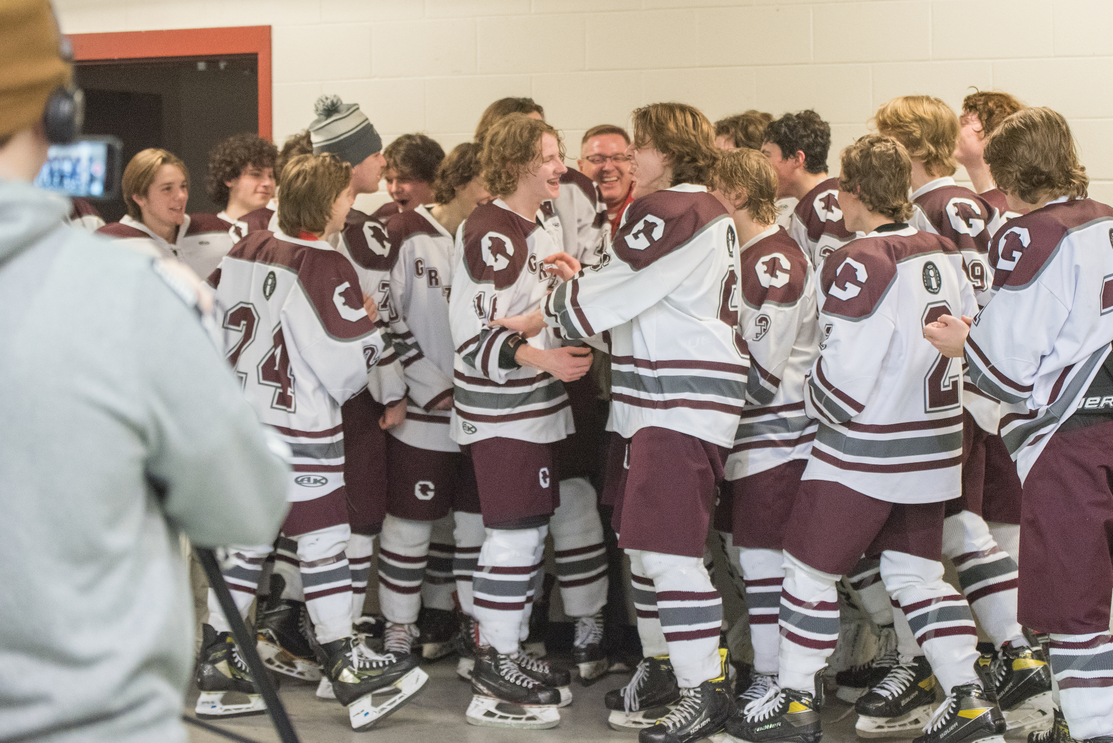 The Spaulding hockey team kept on playing their game. They just continued to work and create chances. Sometimes that leads to goals that aren’t even really chances. For example, they tied the score, 3-3, with 1:55 left in regulation on a goal that would not have counted as a shot on net if it didn’t go in the net. I’ll explain.