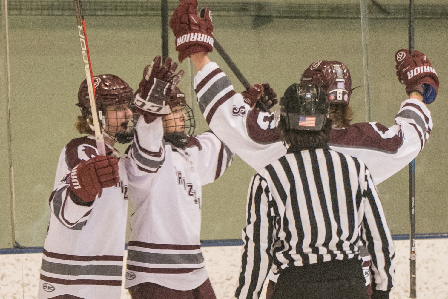 For the Spaulding hockey team, they scored similar goals at either end of the ice. Jackson Farrow barreled down the left wing and fired a shot past Santoro for their first goal at 11:18 of the first period. Then in the second period, Nate Gagnon exploded up the right wing, beat the Goffstown defenders to the puck and scored on a shot as he flew through the face-off circle.