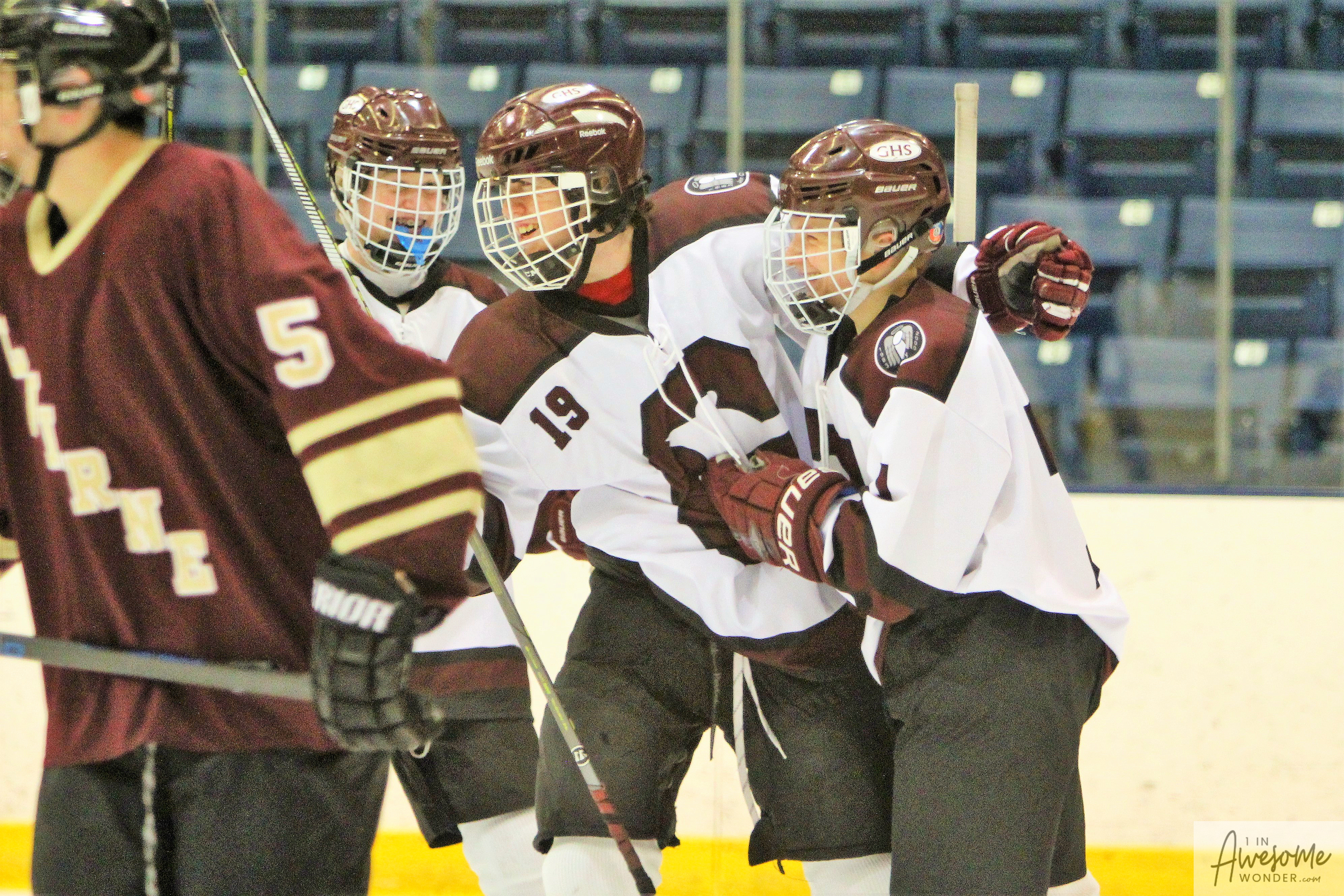 Alvirne started getting one scoring chance after another in the third period. Levi Griffin scored an unassisted goal to cut the lead to 9-3 at 3:36 of the period. Then at 6:25, Tucker DesFosses hit Levi Griffin at full speed with a gorgeous two-line pass from his own end. Griffin barreled past the Grizzlie defense and scored his third goal of the night. It was 9-4. Five minutes later, Ian Morse scored for the Broncos from Jake Natola to make it 9-5. Finally, Goffstown stemmed the tide when Brett Lassonde lit the lamp with a beautiful shot up over the left shoulder of Jackson Dowd in net for the Broncos. It was the junior defenseman’s first career goal. Noah Charron assisted on the goal as he dropped the puck at center ice and Lassonde grabbed it, made a mad dash up the ice and scored the memorable goal. His teammates on the ice were visibly thrilled to celebrate the goal with Brett. With 30 seconds left in the game, Damien Barahona scored for Alvirne from Justin Carbonneau to make the score 10-6. Goffstown got the win, but Alvirne never stopped coming after the Grizzlies. Alvirne outshot Goffstown in both the second and third period’s, although the Grizzlies did outshoot the Broncos 30-27 for the game.