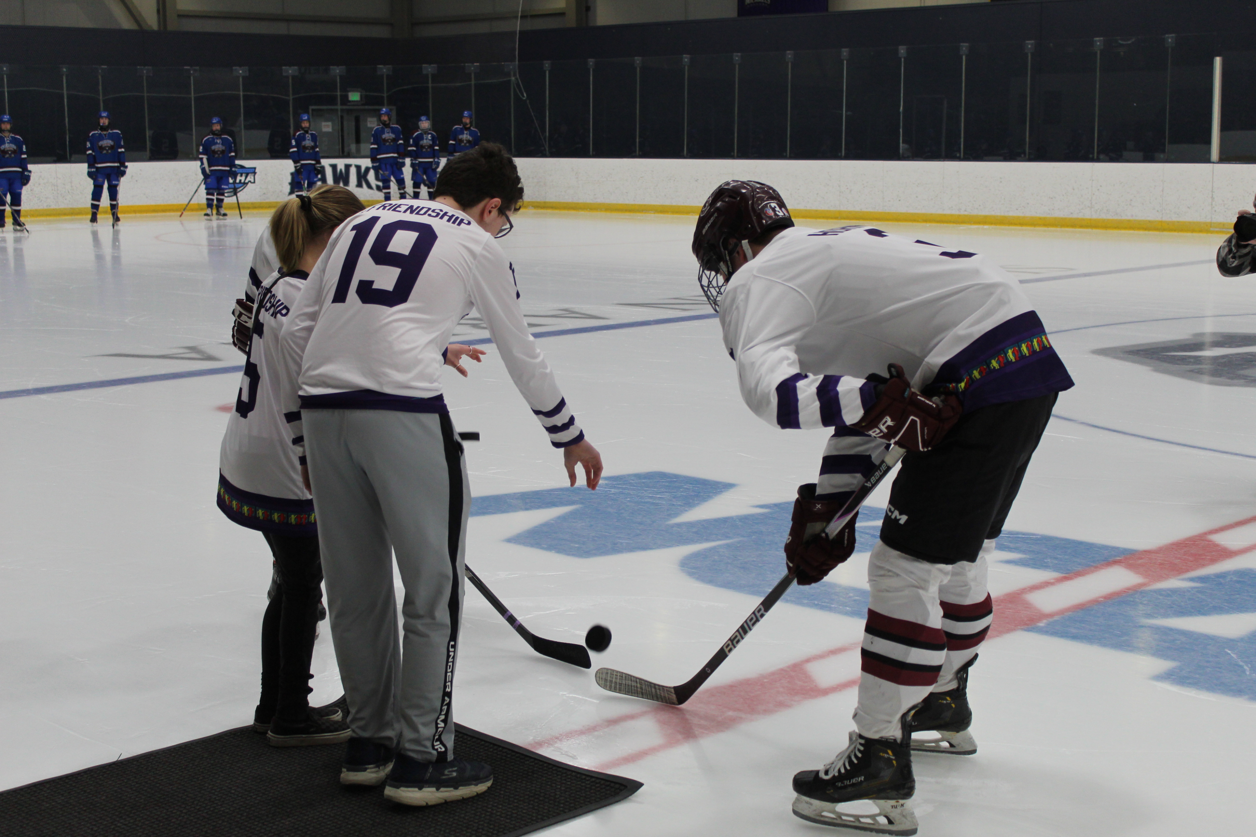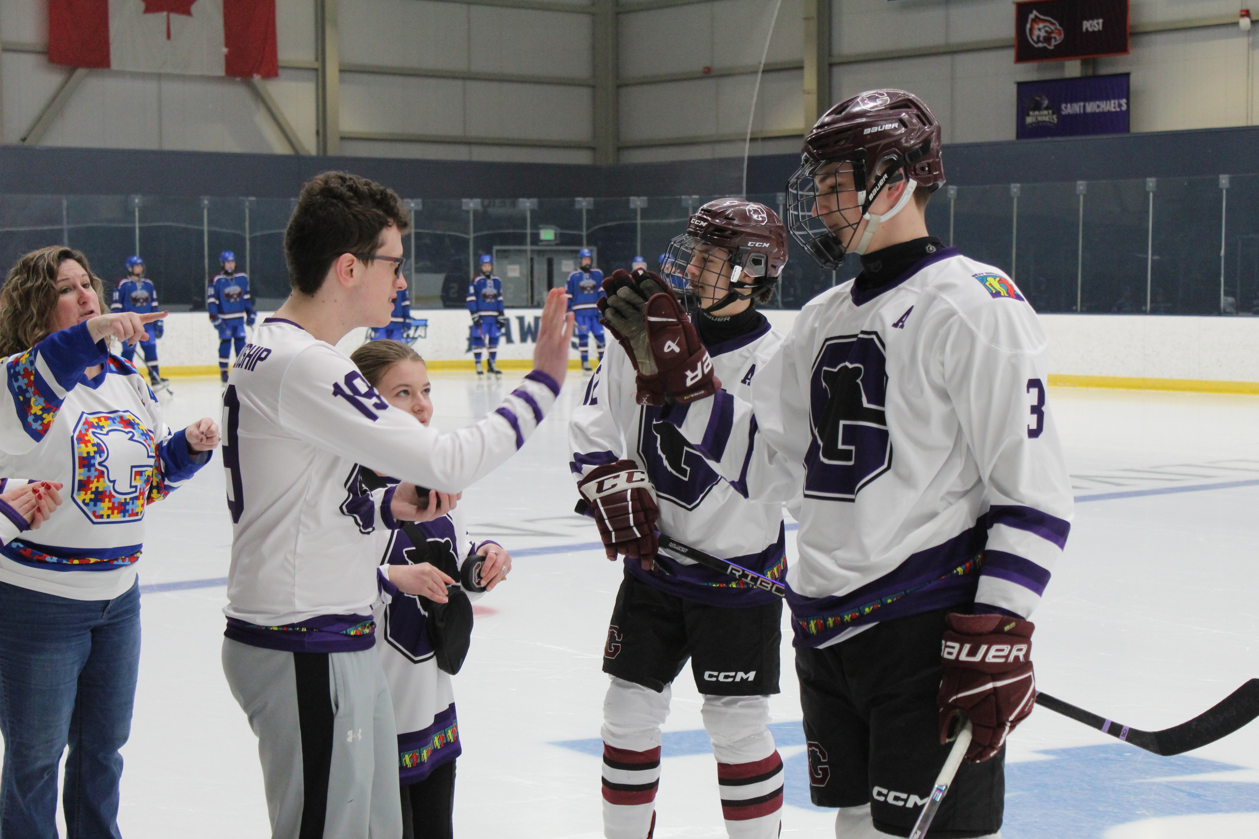 On the ice, members from the Goffstown High School chapter of Best Buddies participated in a ceremonial puck drop. Grizzlies Alternate Captains, Jackson Horne and Owen St. Onge, both are also a part of Best Buddies club. They met at center ice before the teams warmed up and took the ceremonial face-off. Even so, the teams, the coaches, and the fans were all there to see it as well as to cheer them on. It was undeniably a wonderful moment during a long season.Β