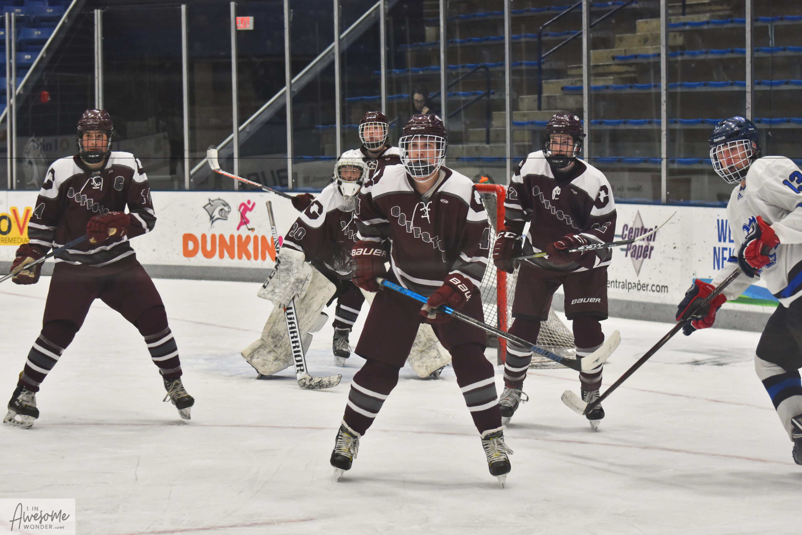 Oyster River ultimately won the game 3-2. They had two goals called off in the first period. One goal was waived off for being kicked into the net. Ok, fair enough. The second one was blown dead after James Amorelli made a great save and the puck was still near his pad, at the goal line but the ref lost sight of it and blew the play dead before the puck was driven into the net. Oyster River overcame the misfortune and kept doing what they do. They play sound, structured hockey and rarely beat themselves. That is not to say that Goffstown had no effect in the matter because they certainly did. The Bobcats relied on every layer of defense they could muster, which often meant that Claden Daubney was the last straw that just wouldn’t break. What a game.