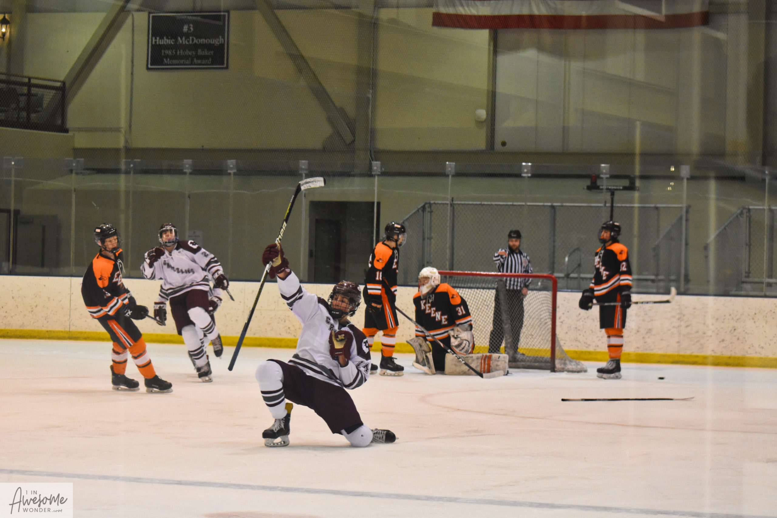Goffstown was getting chances and playing well despite trailing by two goals. Then Drew O’Brien dug out the puck out of a pile at his own blue line and on to the stick of Colby Gamache. Colby made a brilliant rush through center ice and was skating hard for the net when he dished the puck to Grady Chretien on his left. Chretien put the puck in the net for an historic goal, his 50th career goal. It was a great play. I only know of three other players that have eclipsed that mark in their Goffstown careers. Dan Mercier (’02) had 60 goals. Noah Charron (’18) had 60. Sean Naughton (’04) had 54 goals, and now Grady has 50, and counting.