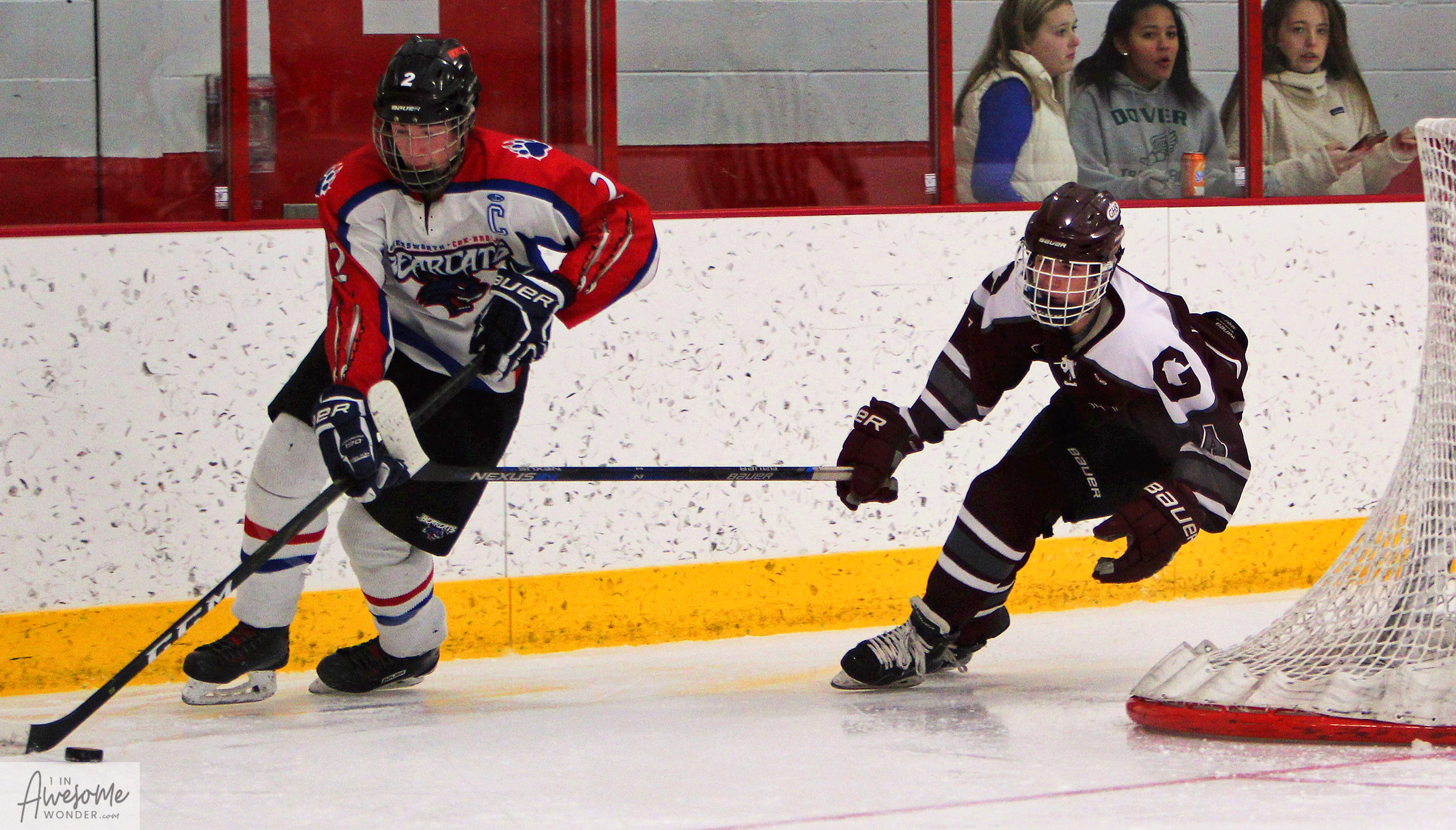 Goffstown traveled to Rochester, NH to play the Somersworth-Coe-Brown Northwood Academy Bearcats who were 2-1-1 in league play when the opening puck was dropped. The combined name of the schools included as the home team is almost as long as the distance from Coe-Brown to Somersworth High to Rochester Ice Arena, at 27 miles and about 45 minutes, just to play at home. In a nutshell, or two, Somersworth-Coe-Brown (SCB) is a good team. Their goaltender, Kevin Baker, is one big reason why this was a one-goal game. SCB’s team defense, circling the wagons in front of Baker, is another reason. Goffstown taking senseless penalties when nothing but good decisions was in jeopardy also played a big role in this outcome. The Bearcats are a good skating team with depth in the skill of skating, and that is a huge asset to have. Goffstown escaped the trip to Rochester with a 5-4 road victory that easily could have gone the other way.