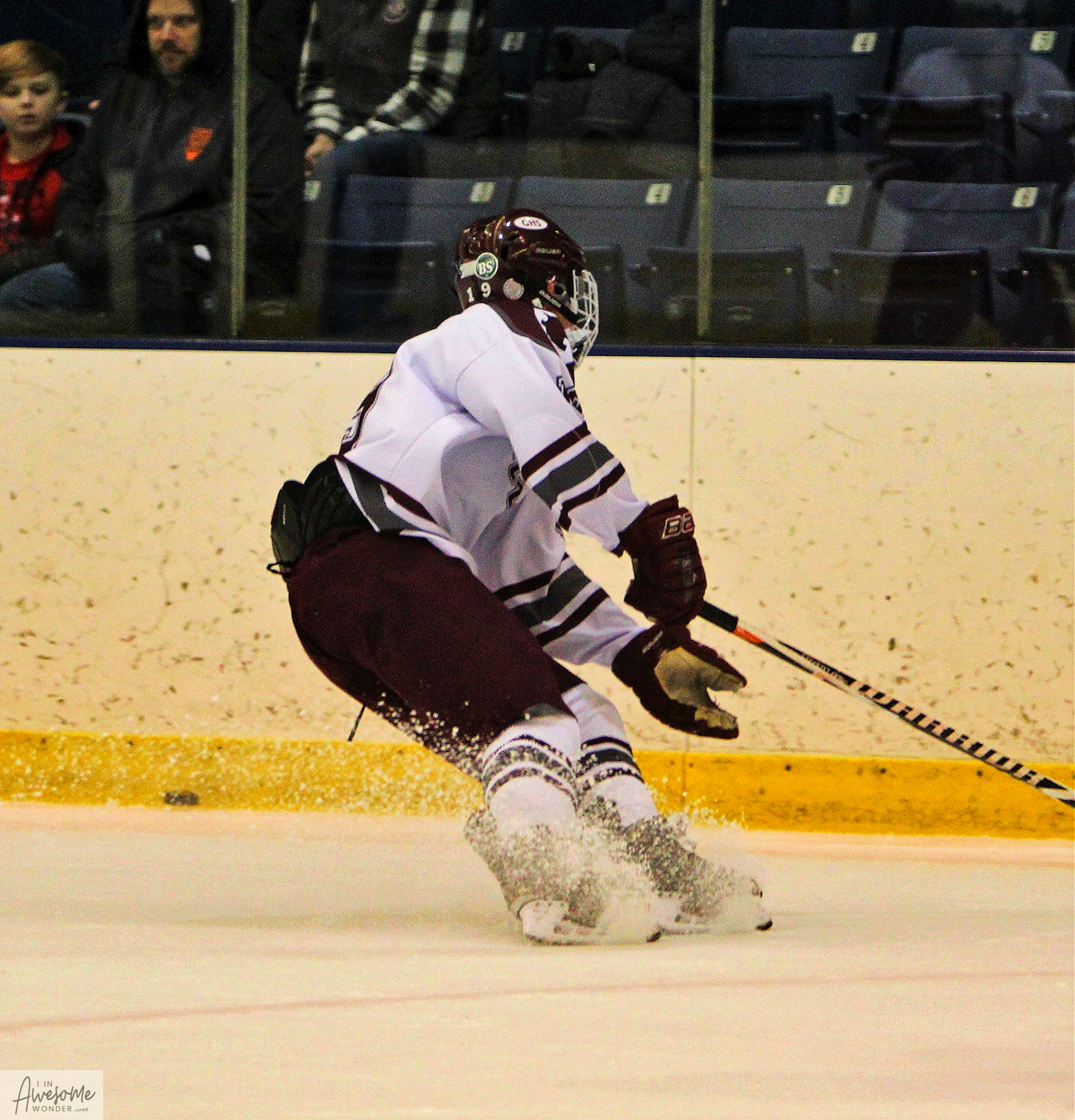 Goffstown came out flying and started getting scoring chances right from the first shift. At first, though,Β the bounces didn’t go their way. Or maybe some of them did. At 3:27 of the period, GrizzliesΒ freshman goaltender, James Amorelli, made aΒ huge left arm save on a point-blankΒ chance by the Red Raiders. More chances came to the Grizzlies, but Spaulding struck first. Ryan Ellis cruised in and scored the first goal of the game, set up by Brady Blaisdell at 8:36. Goffstown answered right back with an unassisted goal from Colin Burke at 9:16. Then aΒ little more than a minute later Lucas Ouellette put his own rebound past Brendan Stanley and the Grizzlies had aΒ 2-1 lead. The play was set up when the puck was worked back to Jacob Noonan at the left point and he worked it to Luke Chase. Chase moved through the slot and passed to Ouellette who massaged the puck into the net with Alex McCarthy on the doorstep just in case. Then the Grizzlies paraded around the ice like it was popular to spend time in the sin bin. They took 11 minutes in penalties over a span of 2:08 game time. Somehow they killed off more than 3 minutes of being down a pair of skaters.