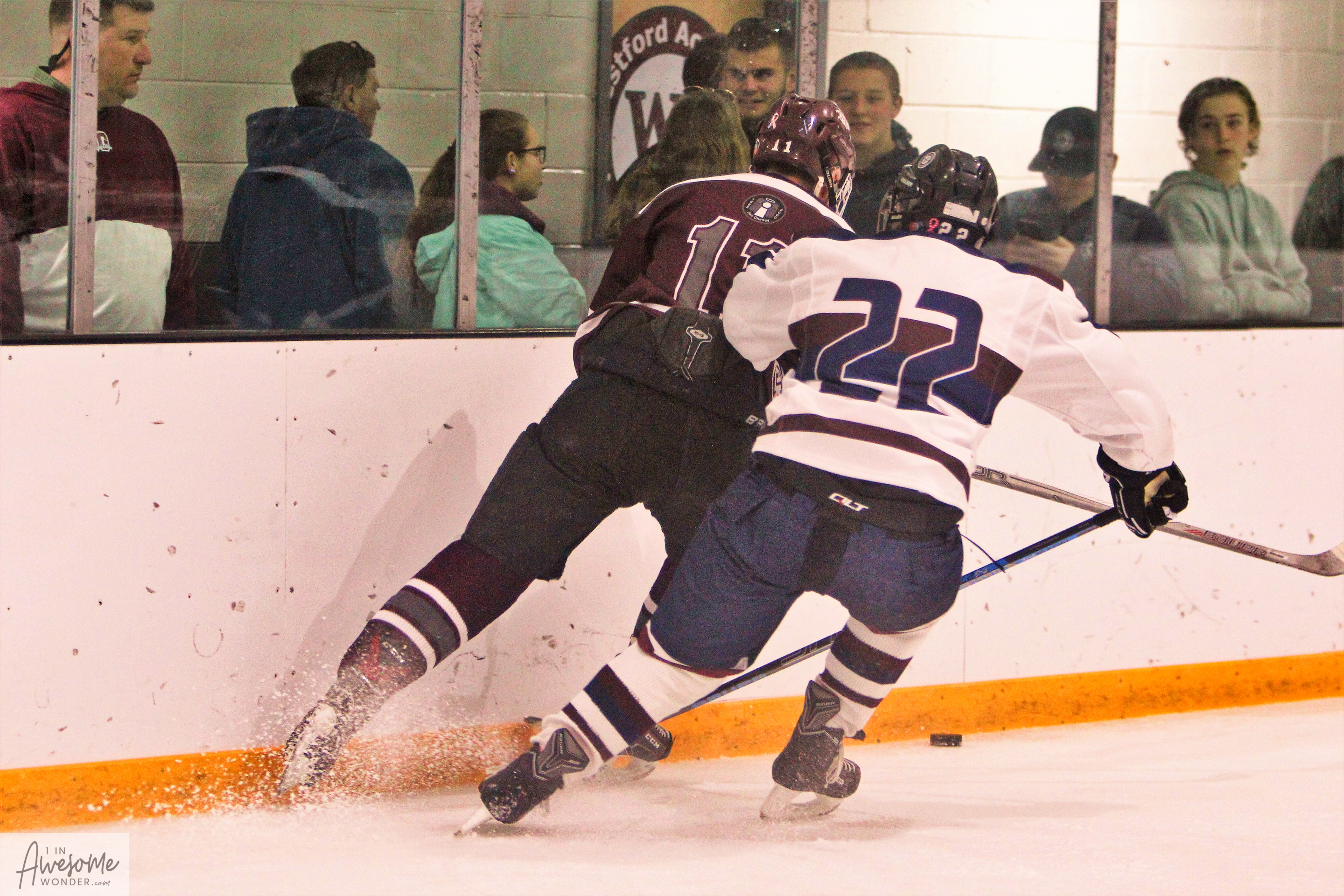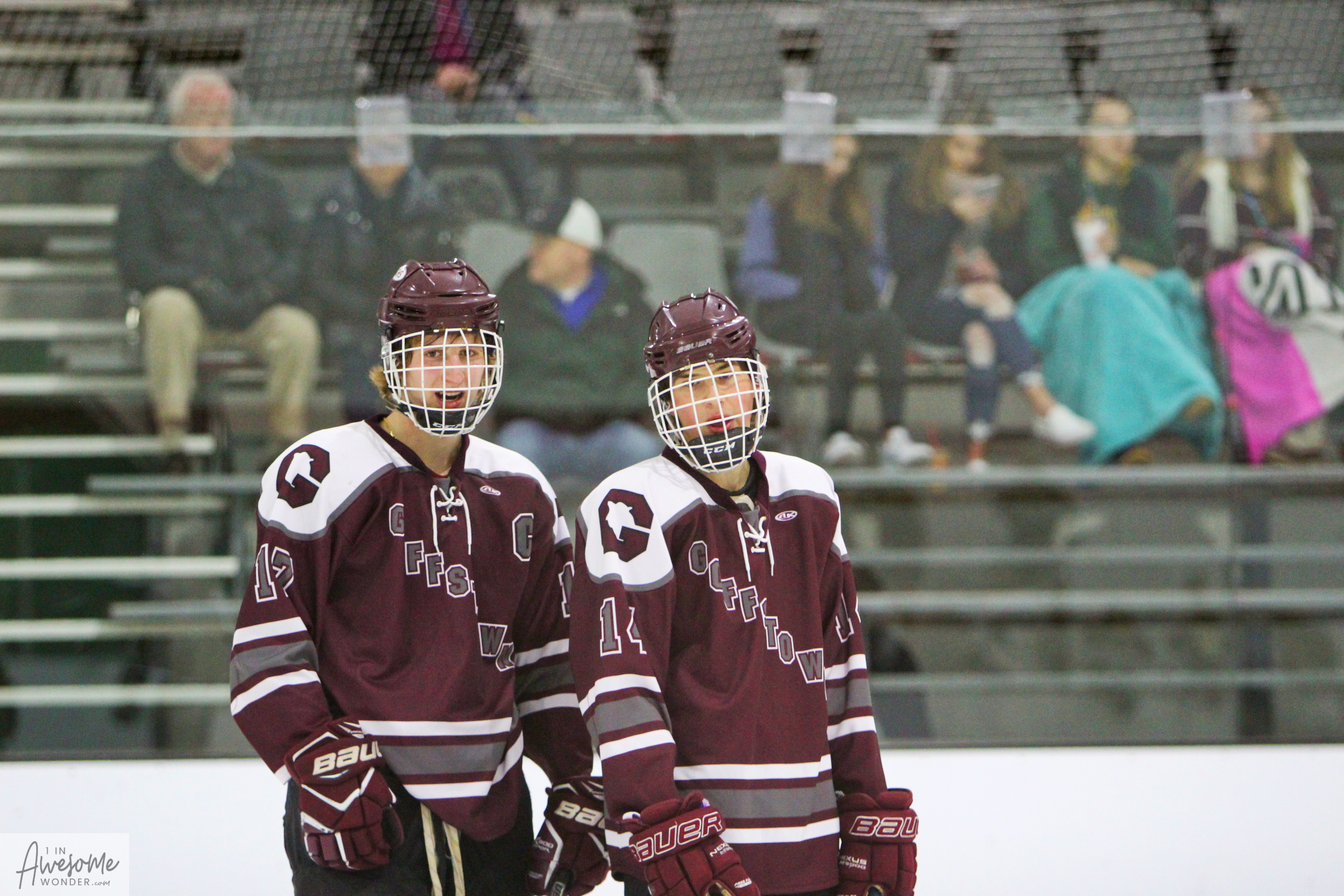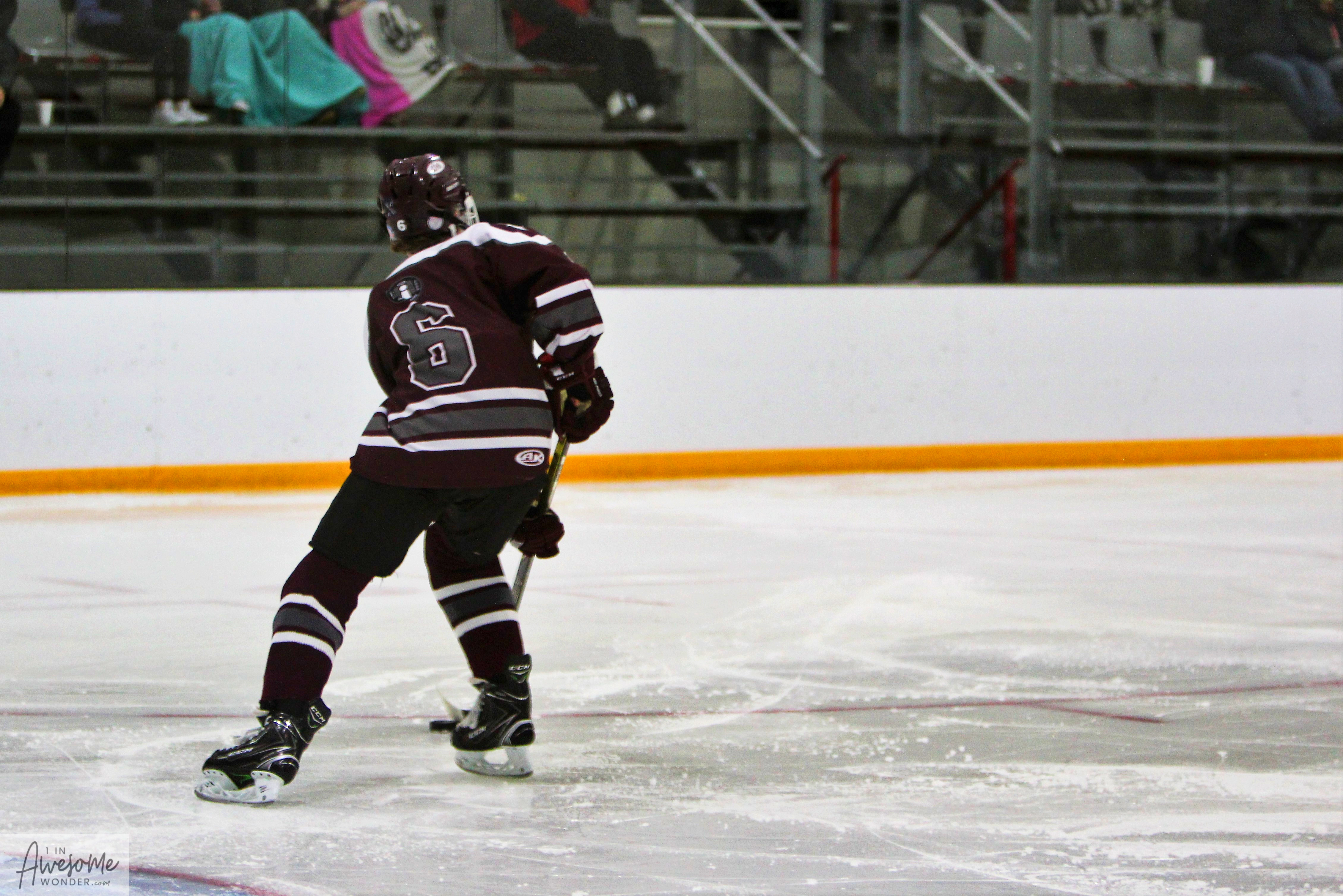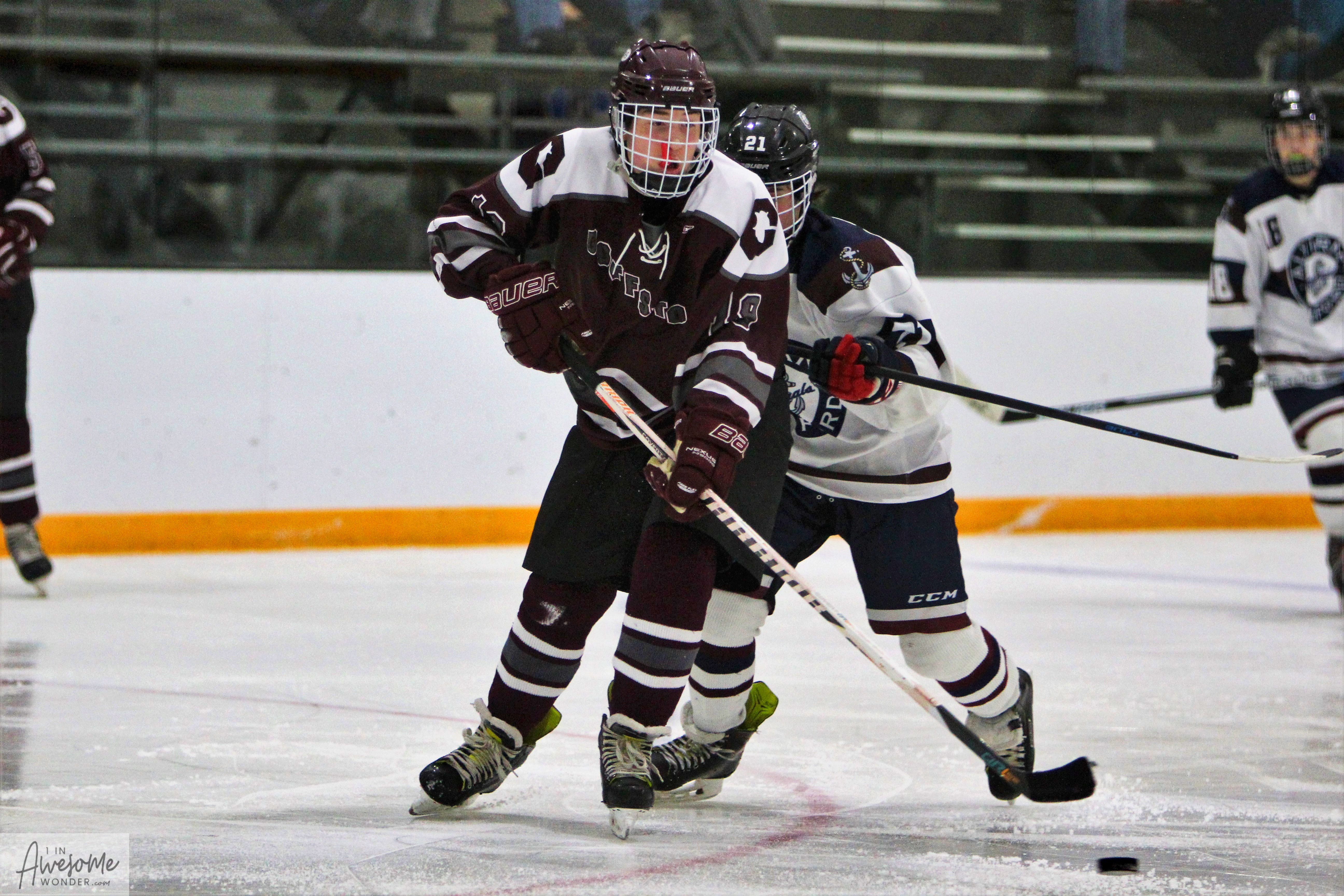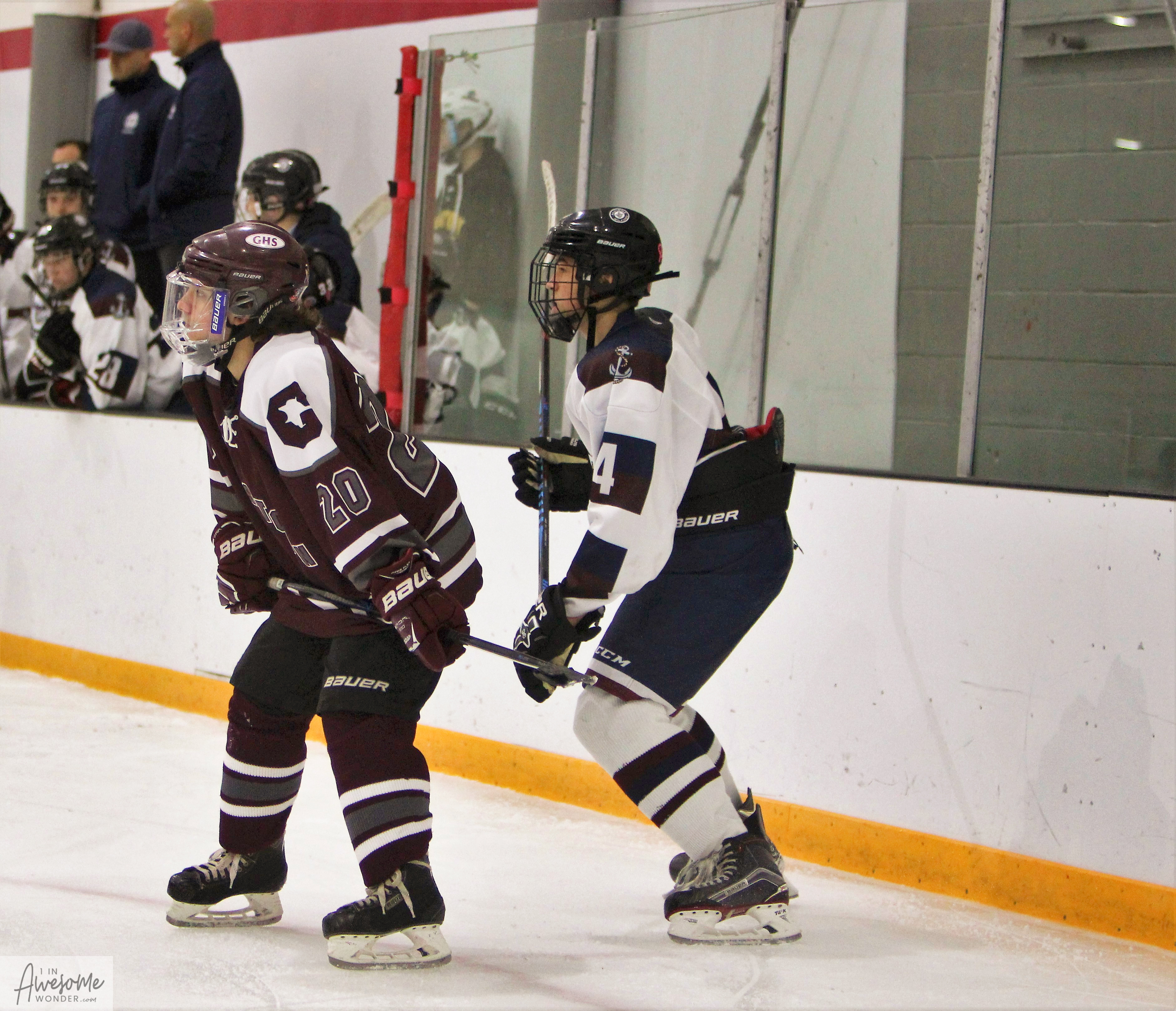 Bobby Pace approached Jacob Noonan and said, “I’ll be your 22.” A thoughtful gesture as Jake’s D partner #22 Brett Lassonde sat out the action. (Photo by Charron)