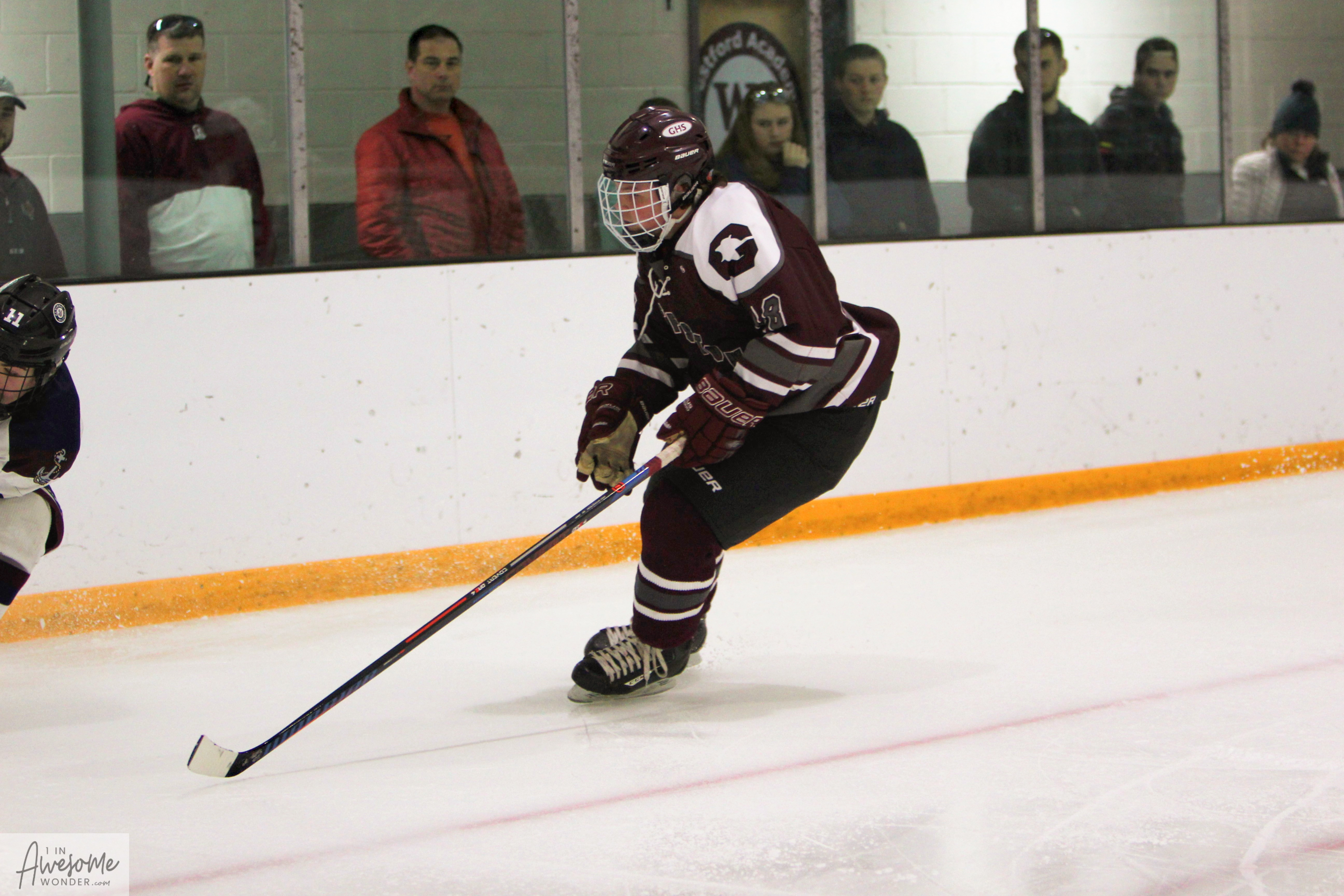 Less than a minute later, Levi Griffin made a gorgeous long-distance breakout pass like a perfectly thrown deep ball from a great quarterback and Zac Girouard was off to the races. James Amorelli came out to cut the angle on the breakaway attempt and receded perfectly, making a brilliant right toe save to keep the score at 1-0. And the period would end with the score 1-0, and Goffstown trailing in shots, 12-7.