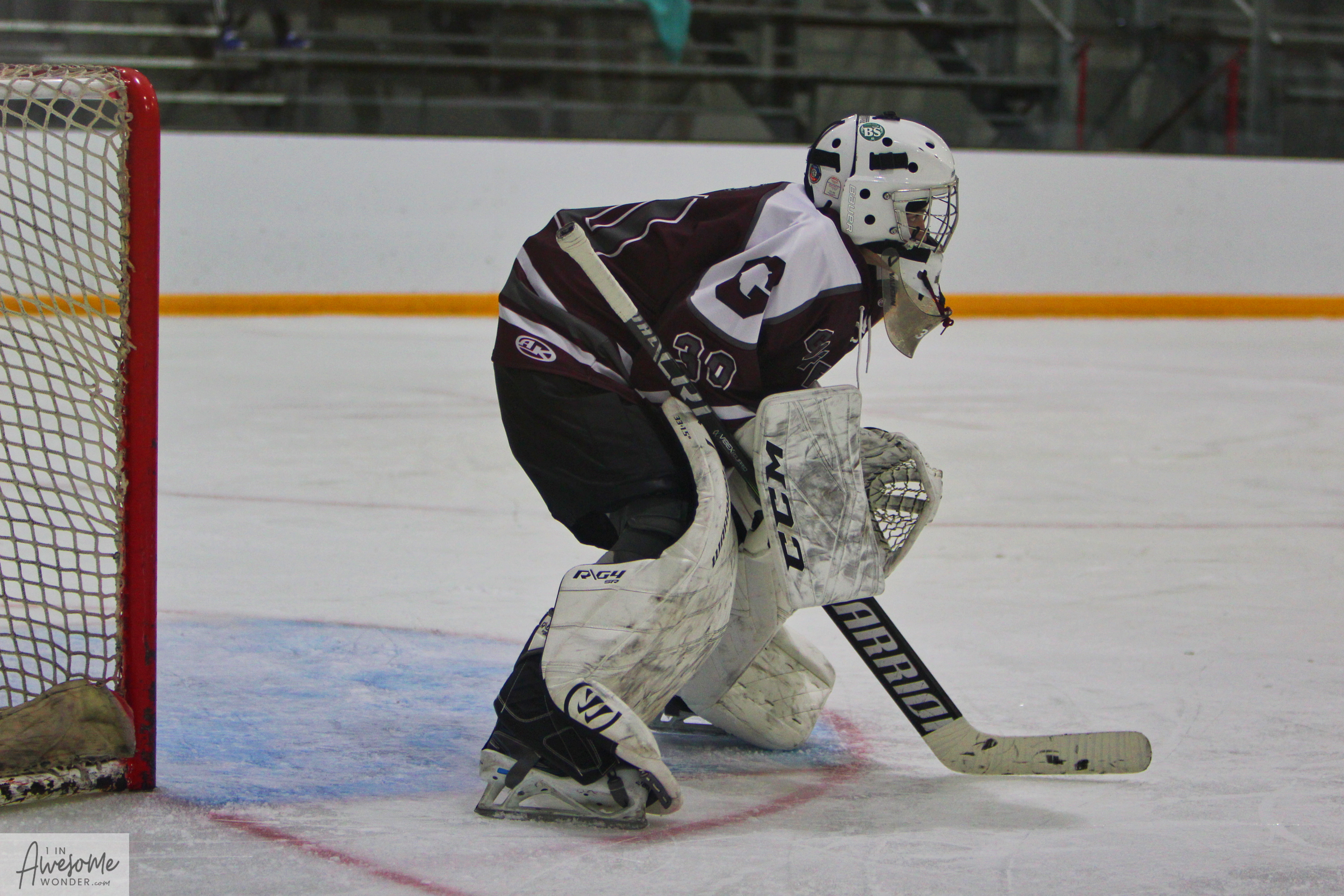 James might have been crouching but he wasn’t hiding from the spotlight, making some tremendous saves in the 8-3 win. (Photo by Charron)