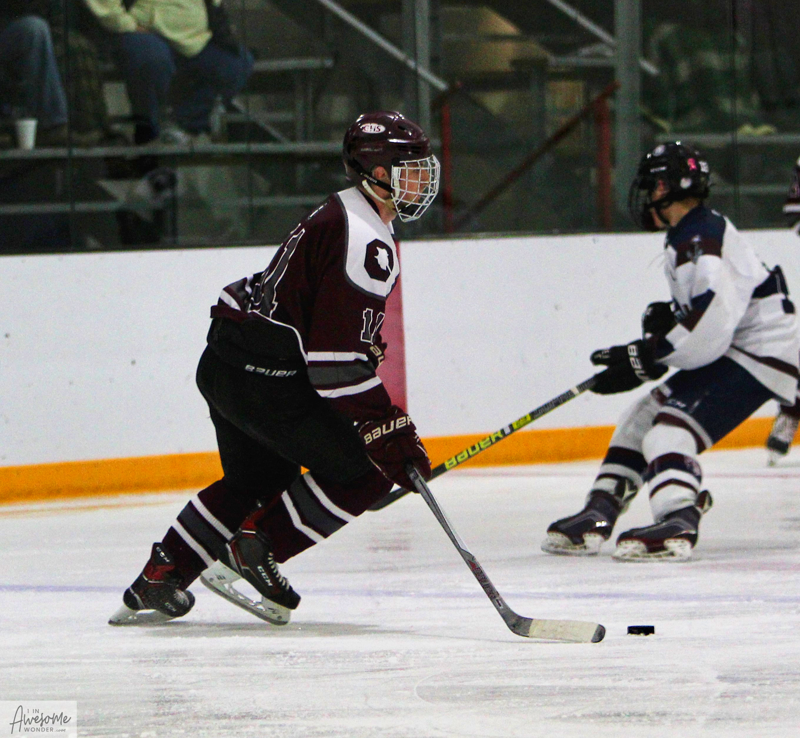 Chretien carries the puck, but yes, he sees you. (Photo by Charron)