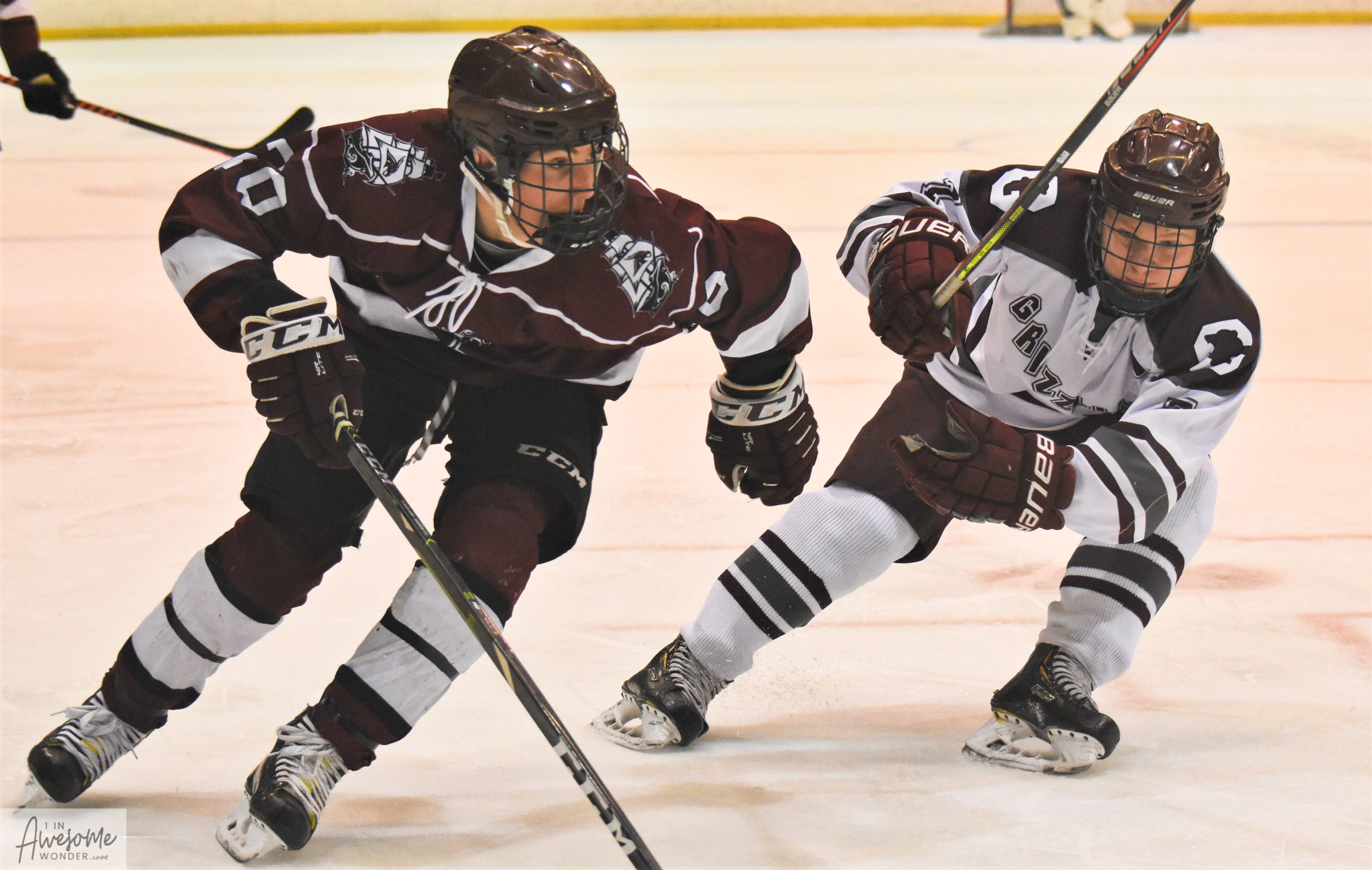 Maybe it was just a good night’s sleep or maybe a self reflection and renewal to taking care of the details. Either way, the Grizzlies came out and played an outstanding first period of hockey against the visitors from Portsmouth-Newmarket. Goffstown held the Clipper Mules to one shot on goal, which didn’t come until the 14:00 mark, and created 13 shots of their own. Jackson Burke who was flying all over the place all afternoon ripped a slick backhand off of the post at 2:47 of the period, but that counted for neither a shot, nor a goal. The Grizzlies lost another player to injury at the 10:56 mark of the first period when David Blodgett hit David Martineau just behind the shoulders and drove him head first into the boards behind the net. With an official looking right at the play, there was no call. Martineau did not return to the ice for the rest of the night. Goffstown got on the board at 11:25 of the period when Eric DesRuisseaux led a nice breakout and pass to Drew O’Brien. The puck ended up on Grady Chretien’s stick and Grady pushed the puck past Jack Bussiere in net to give the Grizzlies a 1-0 lead. The first period would end the score 1-0, and Goffstown out shooting the Clipper Mules, 13-1.