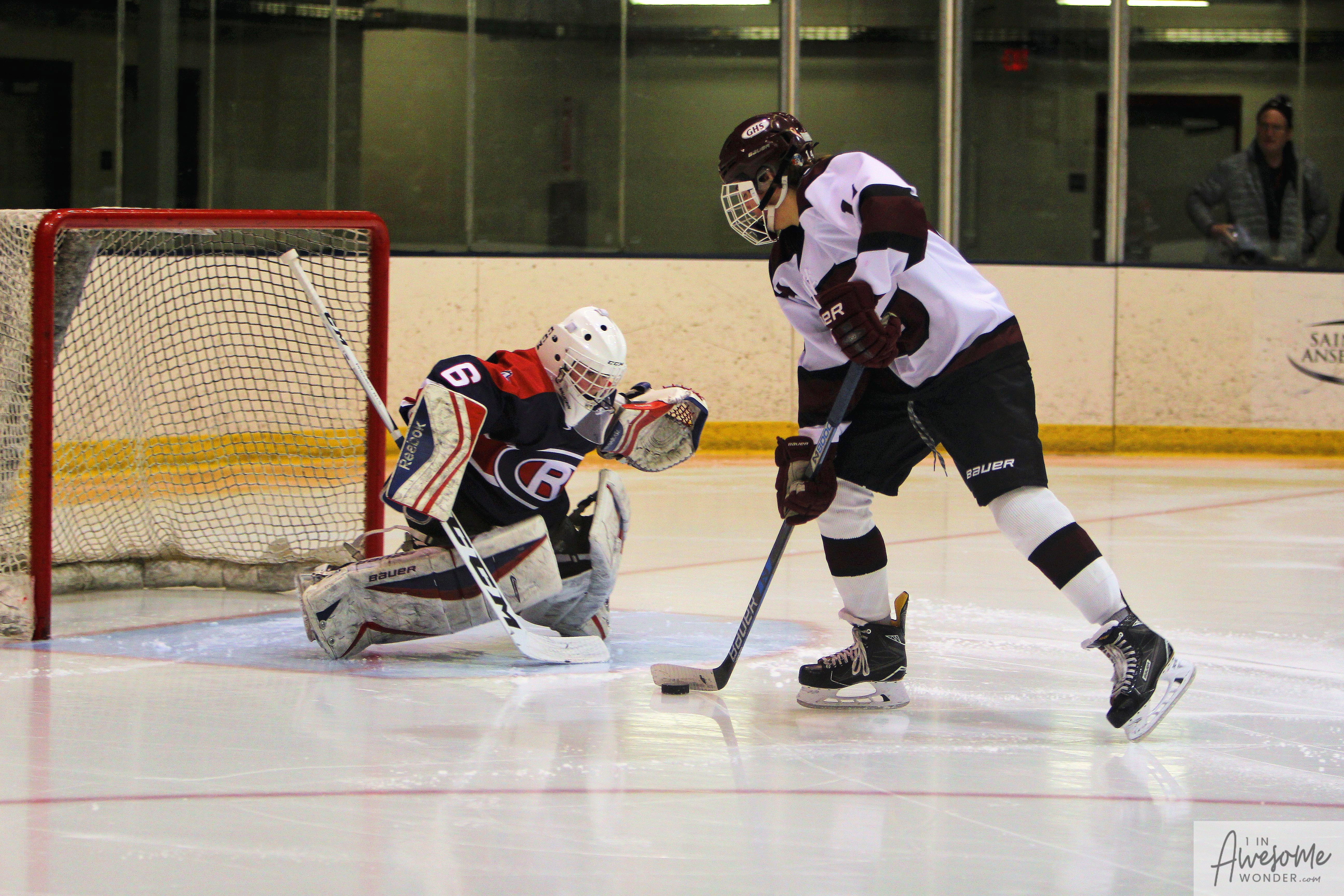 Finally, Goffstown started to mount some offensive zone time, and moved the puck while looking for creases, angles, and openings in which to attack the Bobcats. Sebastian Beal wrapped the puck through the corner back to the point man, Evan McCuaig. McCuaig made a nifty moveΒ to make a pass to Griffin Cook moving in the middle of the ice. Cook let a backhand shot go before Colin Clark could get set to defend the shot, and Cook’s bid found the back of the net giving the Grizzlies a 2-1 lead at 12:23 of the opening period. The score would hold through one, and Goffstown led the shot count 14-7.