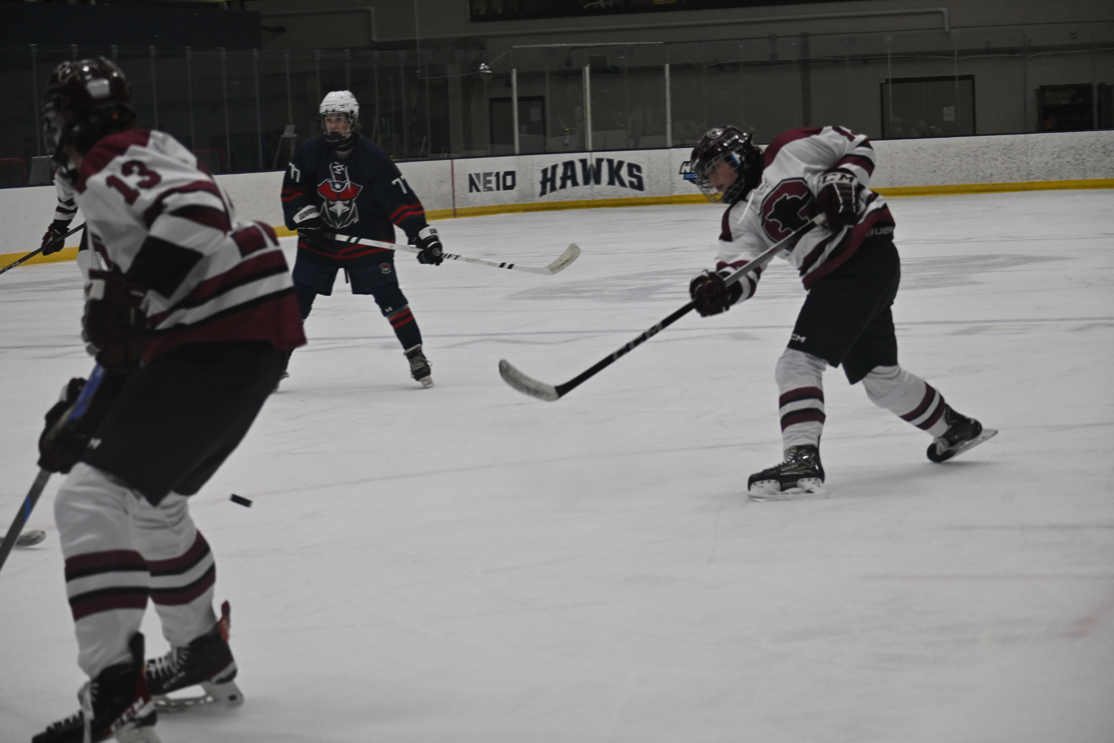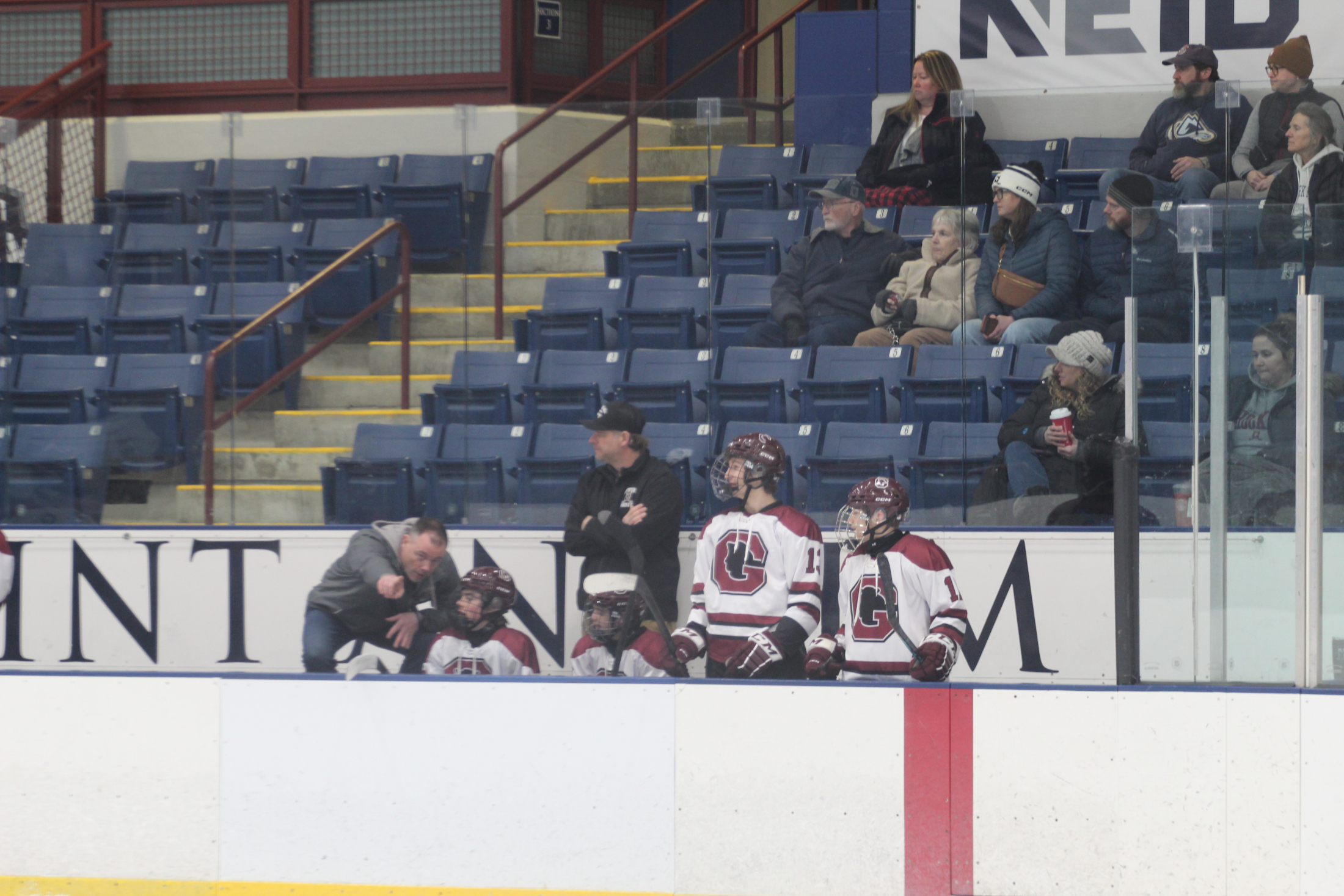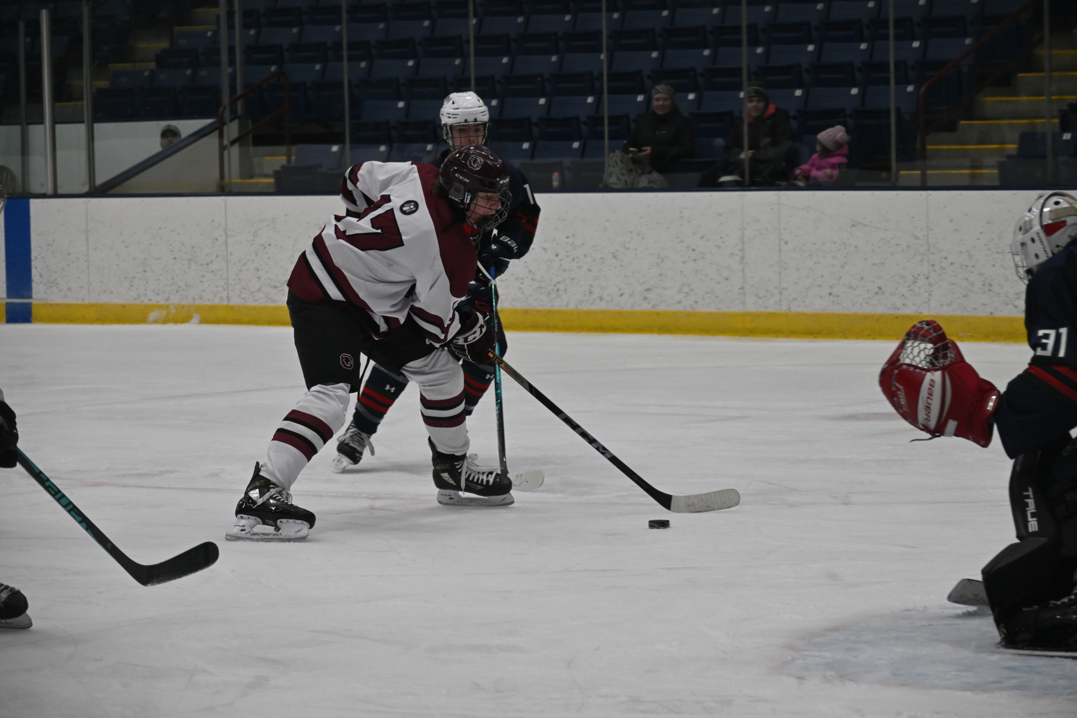 Goffstown got on the board almost six minutes later. Teddy Beal, Cam Desruisseaux, and Cam Fratus were on the fore-check after Michael Wilkins made a tremendous save on Beal’s backhand bid moments earlier. Eventually, the fore-check from Beal and Fratus led to a steal in the zone by Desruisseaux. Jaden Booth and Noah Paris were manning the points and making the space for movement a bit tighter.