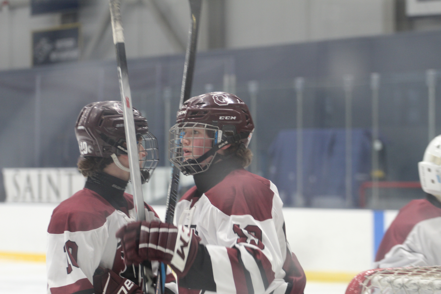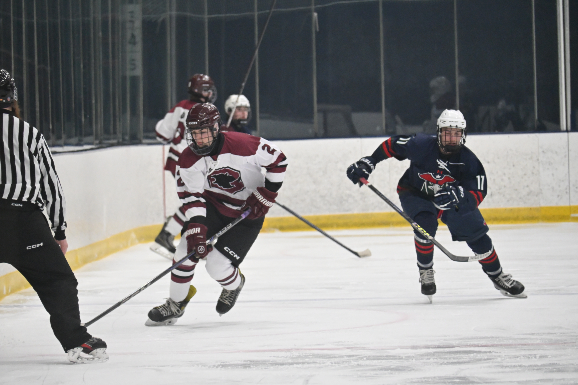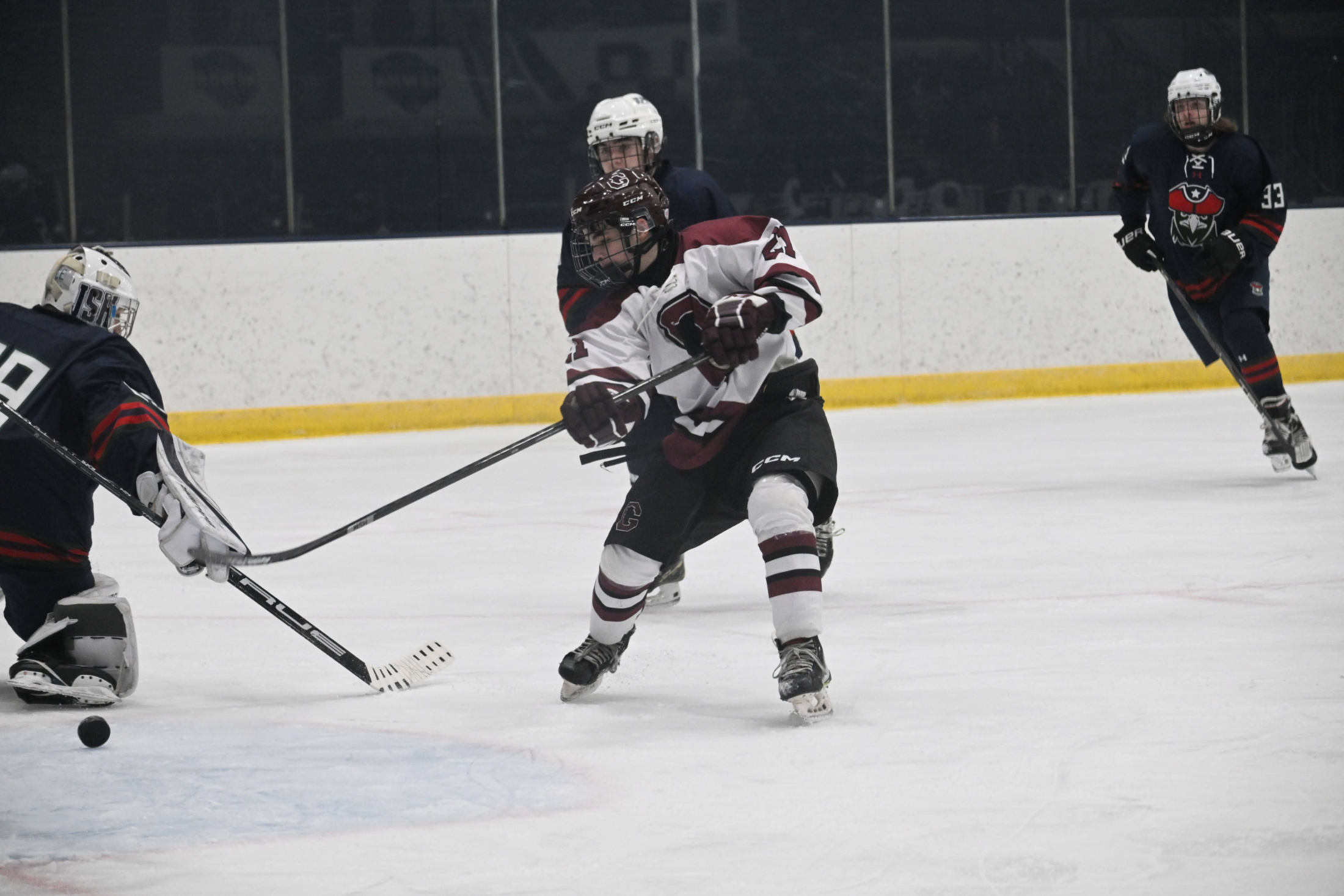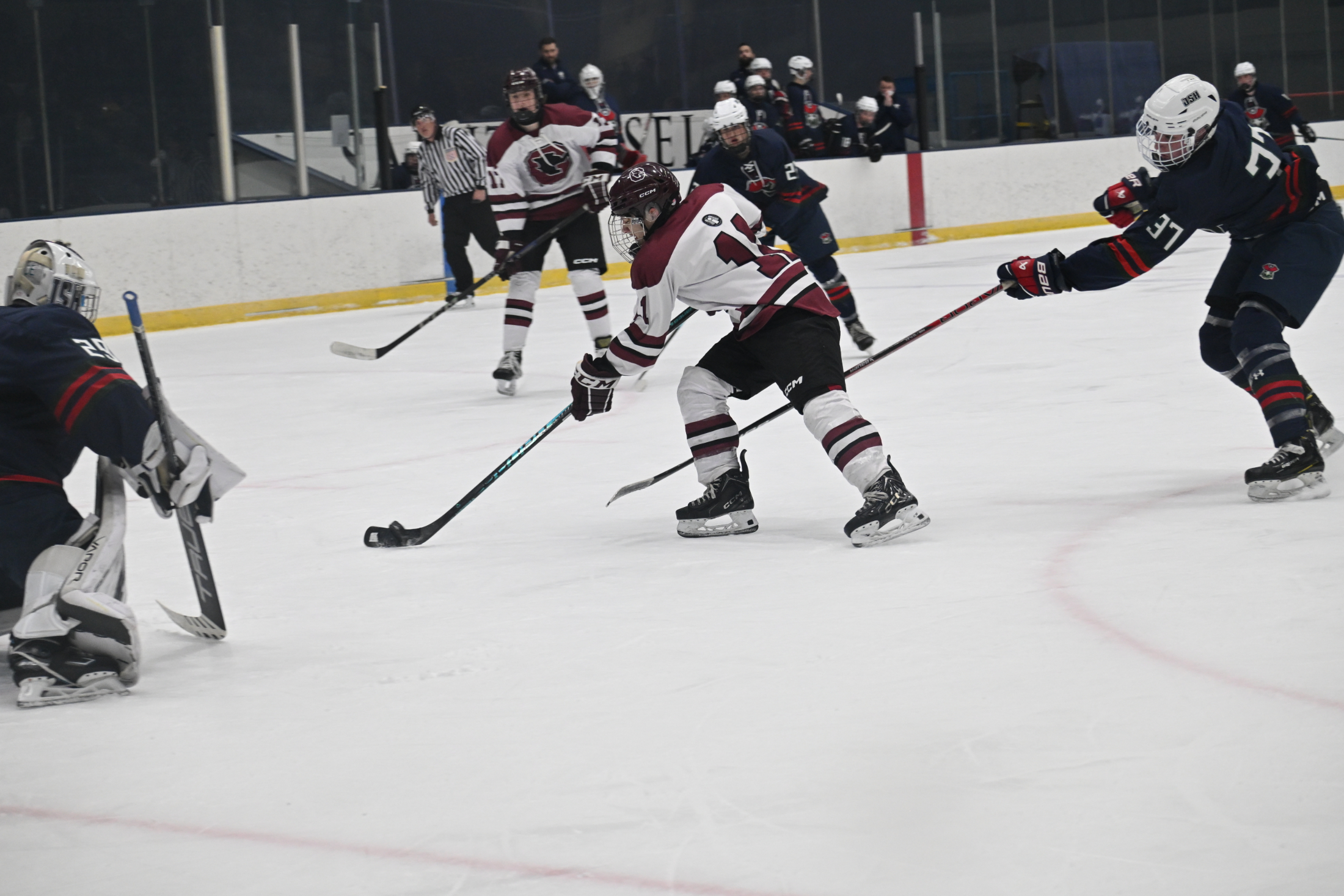 Goffstown got on the board almost six minutes later. Teddy Beal, Cam Desruisseaux, and Cam Fratus were on the fore-check after Michael Wilkins made a tremendous save on Beal’s backhand bid moments earlier. Eventually, the fore-check from Beal and Fratus led to a steal in the zone by Desruisseaux. Jaden Booth and Noah Paris were manning the points and making the space for movement a bit tighter.
