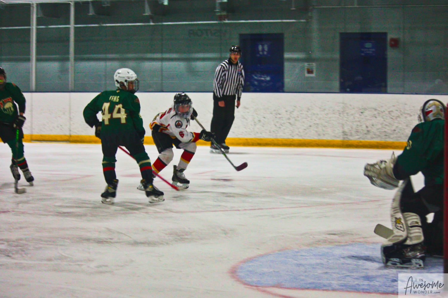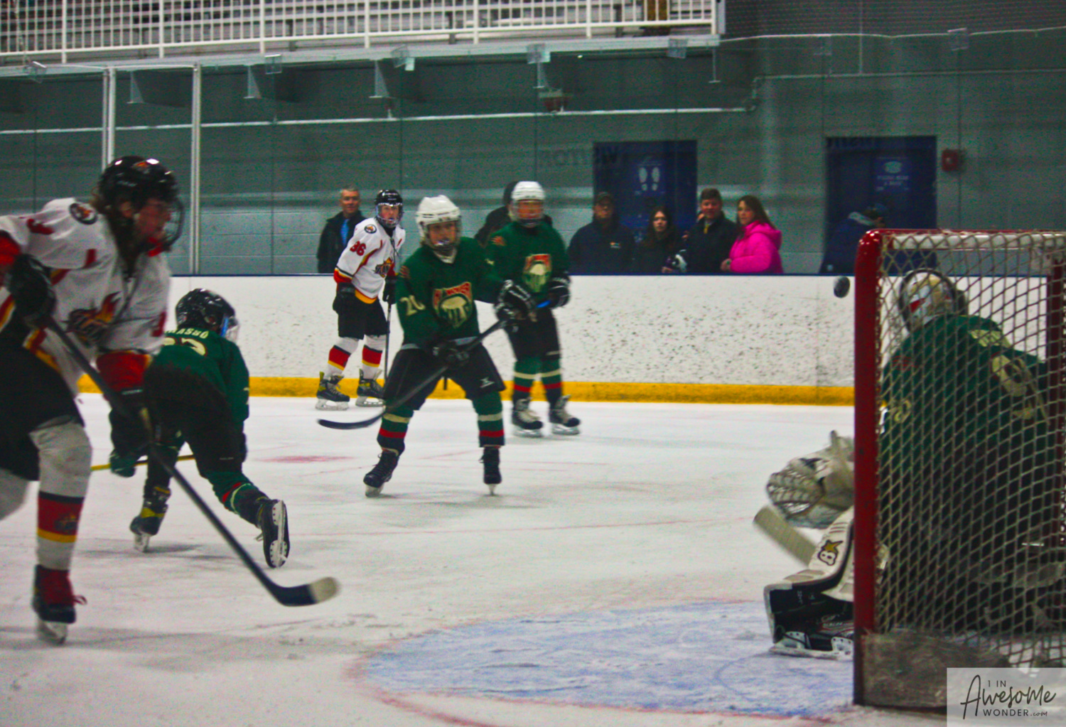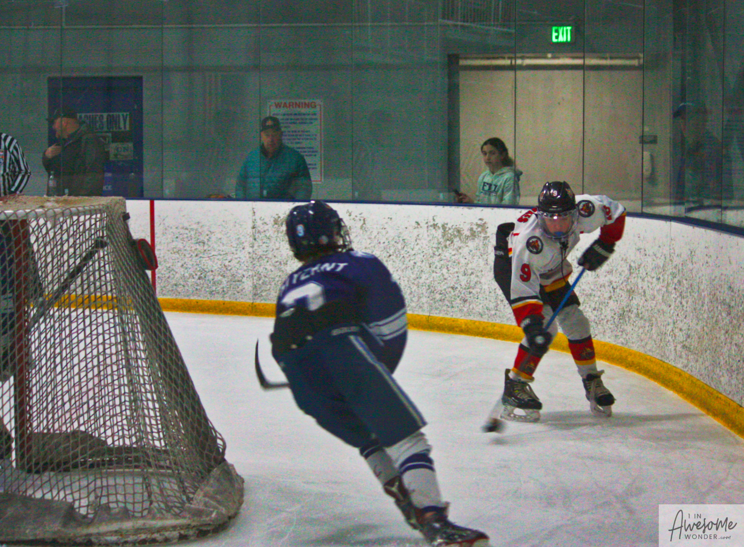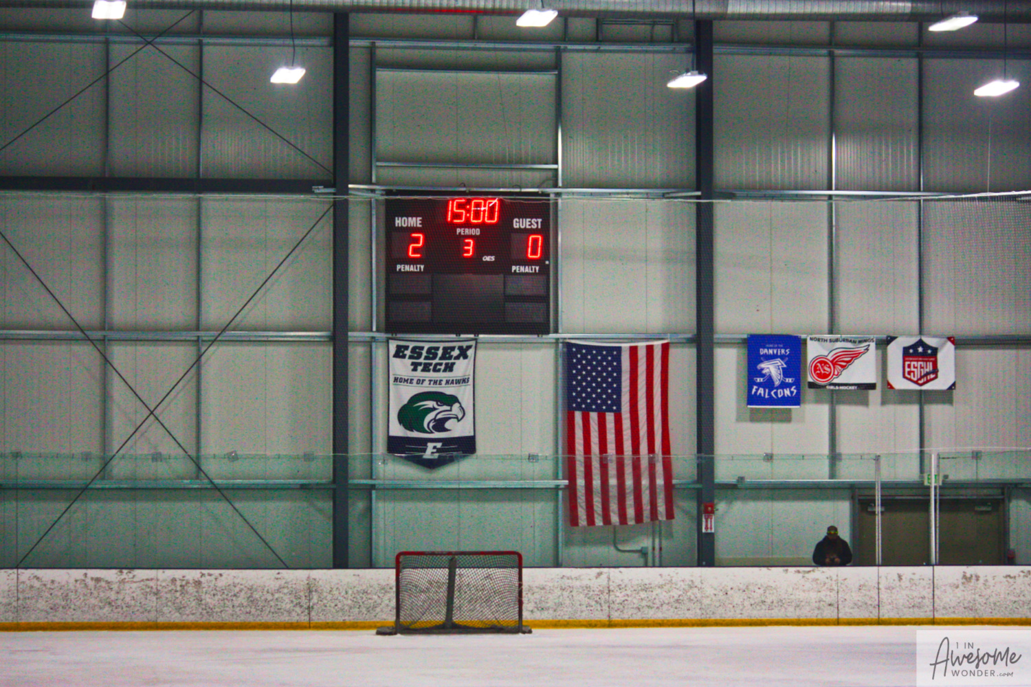 Well, the facility is nice. The Dunkin’ inside was, well, perfectly New England, and a nice option. The snack bar was great to have right there, too. The prison next door kept its distance. The rinks were a nice place to play, I suppose. Rink 2, where the Flames played their games, was the darkest rink of the entire season. But it was the same for everyone, well, except for people trying to take pictures through glass or netting. But we make do. See here.