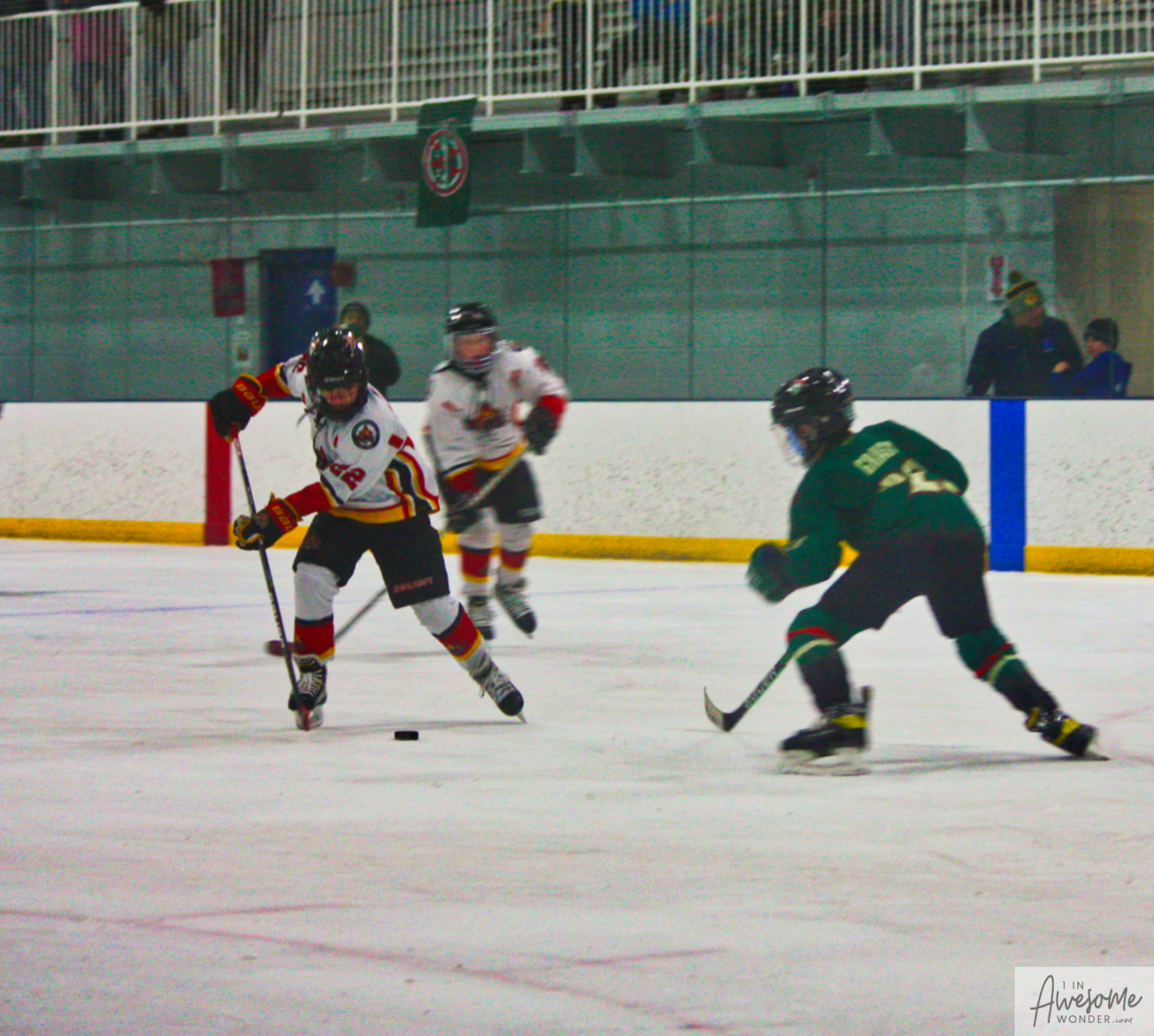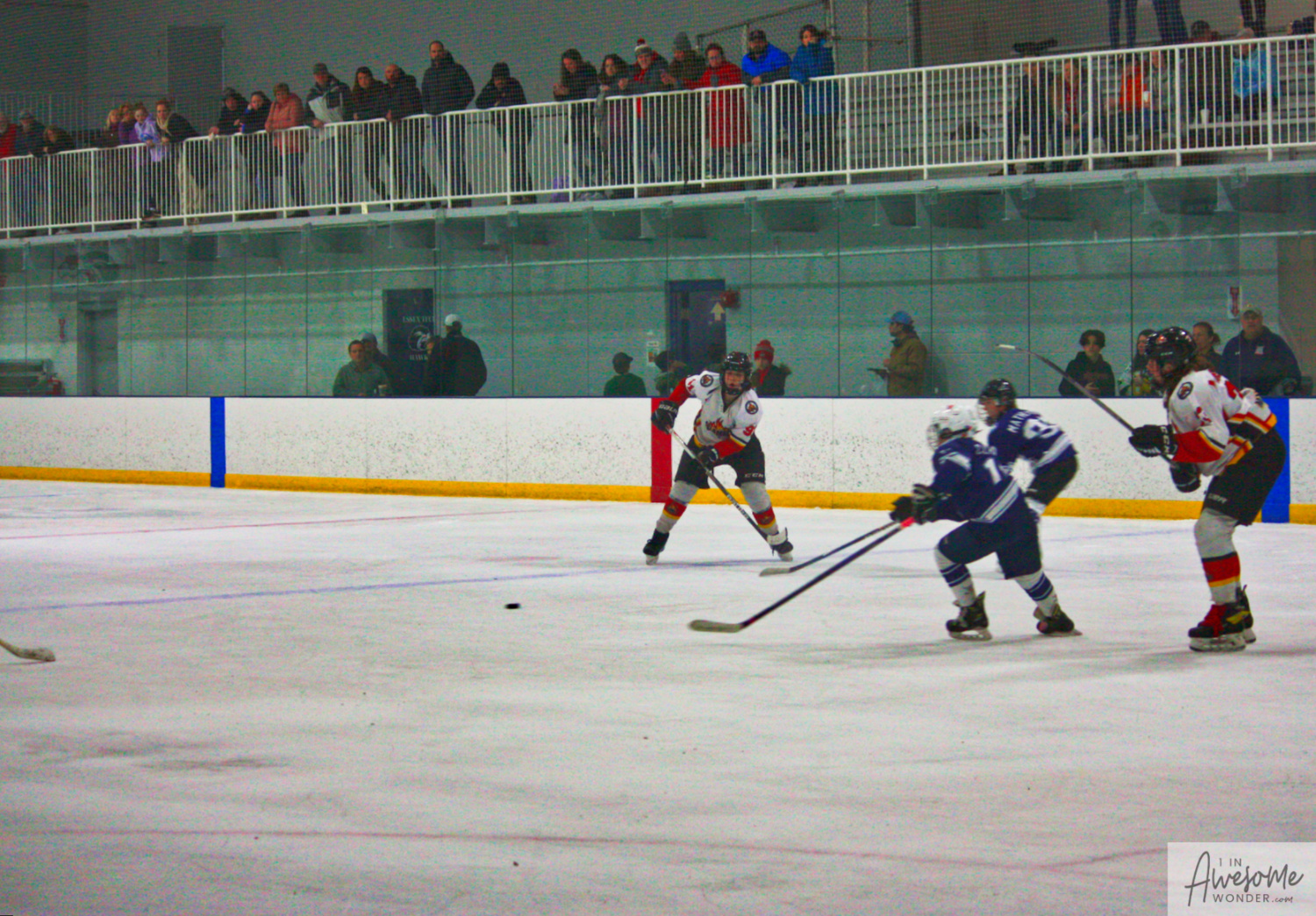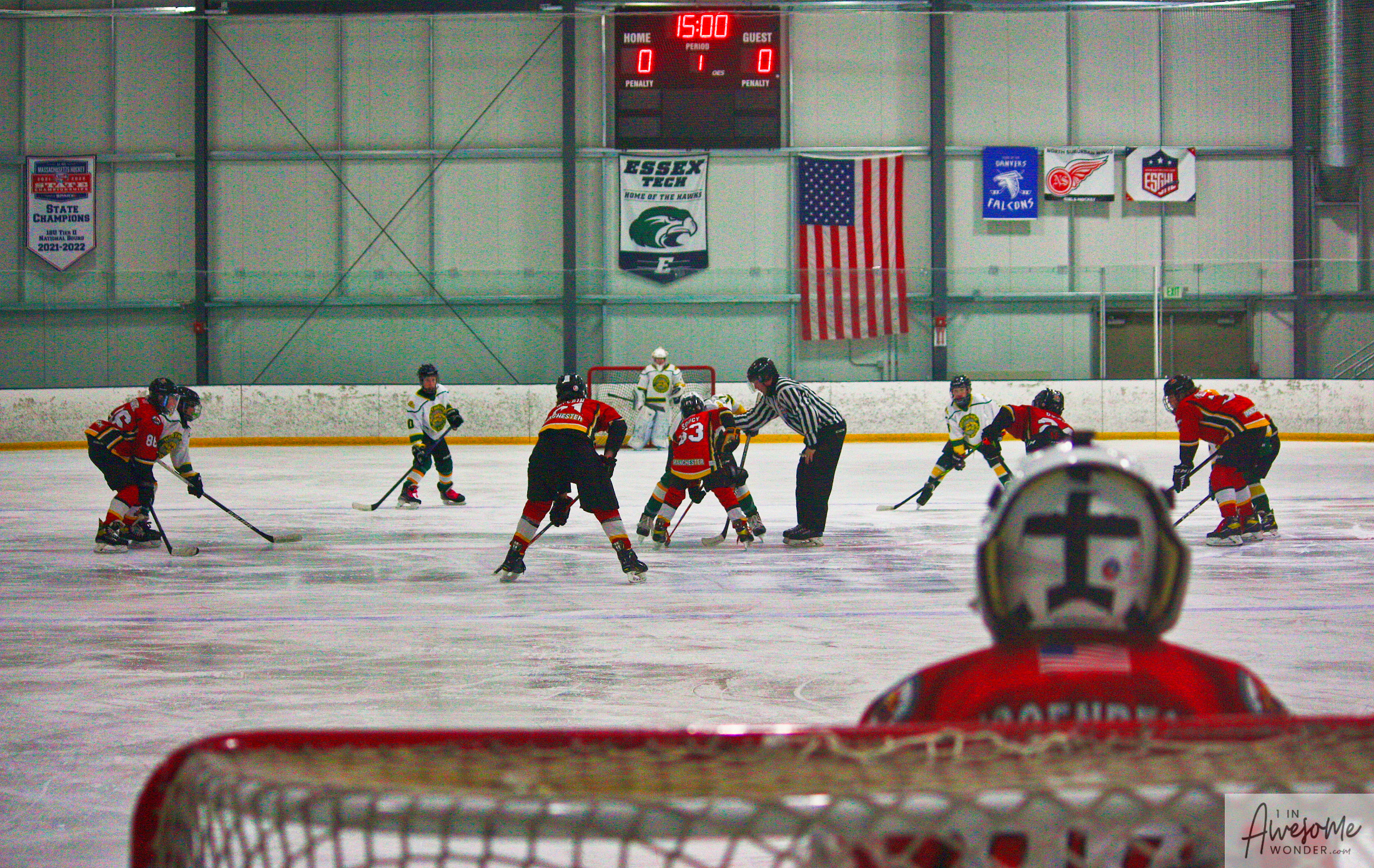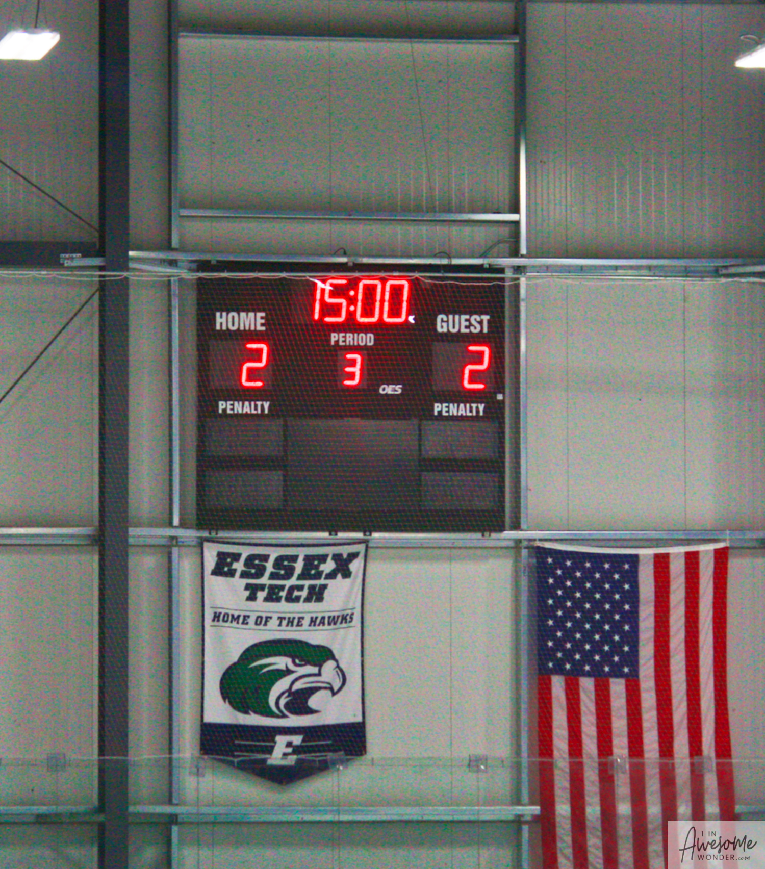 Well, the facility is nice. The Dunkin’ inside was, well, perfectly New England, and a nice option. The snack bar was great to have right there, too. The prison next door kept its distance. The rinks were a nice place to play, I suppose. Rink 2, where the Flames played their games, was the darkest rink of the entire season. But it was the same for everyone, well, except for people trying to take pictures through glass or netting. But we make do. See here.