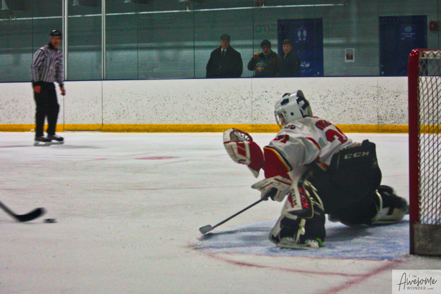 Player #17 for VT, who was awesome, was on a mission after he was tripped and the Flames scored on the play. He scored with 3:53 left to play on a rush through the entire Flames roster it seemed. 4-3. Then he had the game-tying goal on his stick a minute or two later, except that Travis Ingalls had something to say about that. What would’ve, should’ve, could’ve been another goal for #17, was kicked out by a magnificent left pad save on an absolute laser of a shot that hit a stick on the way to the net. Tremendous shot, better save. Lead safe.