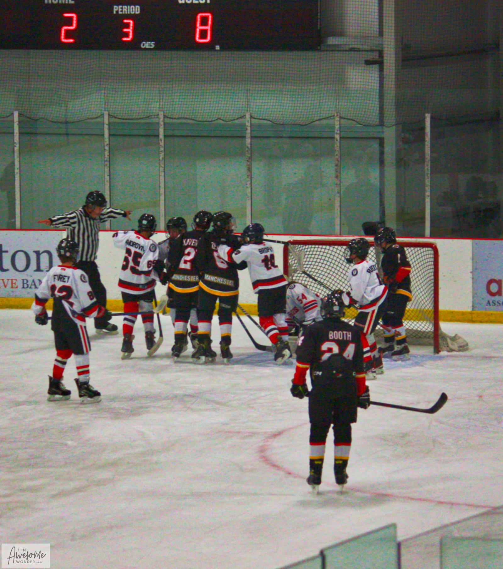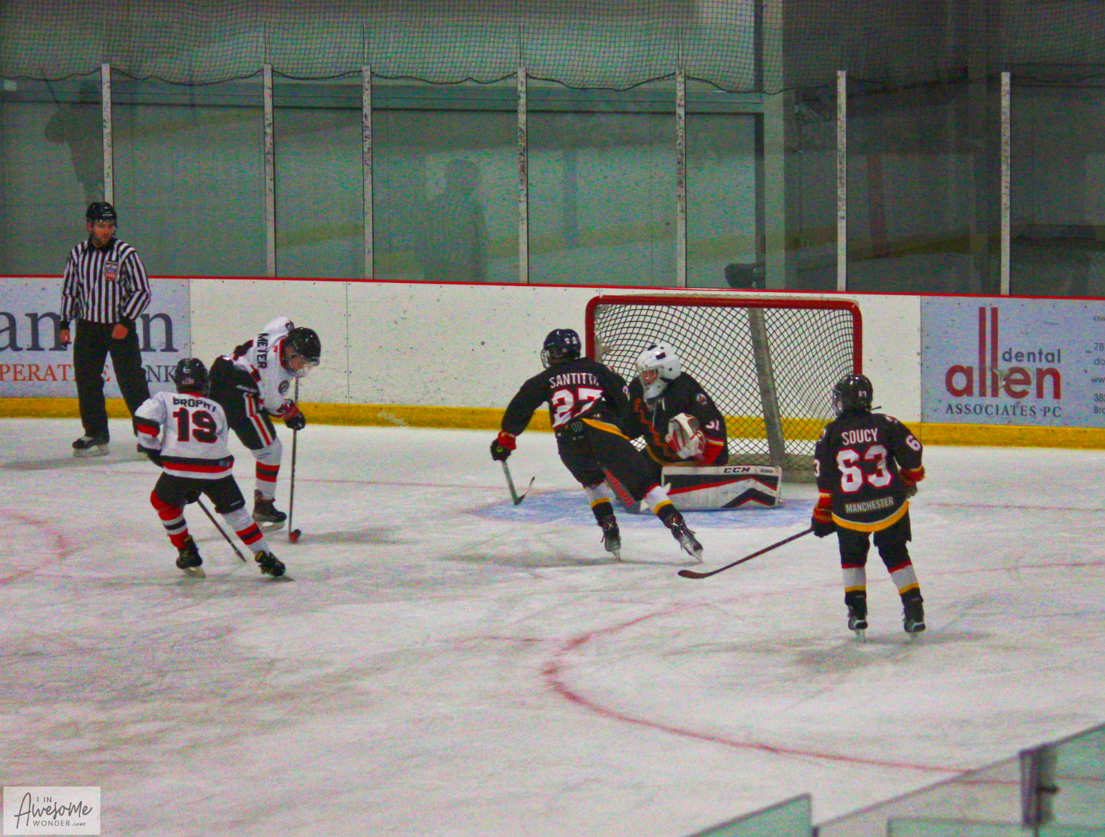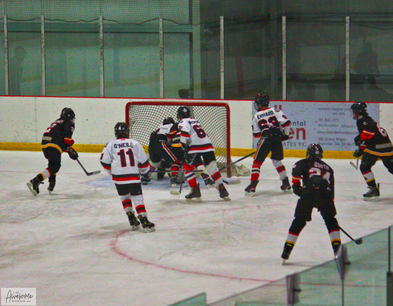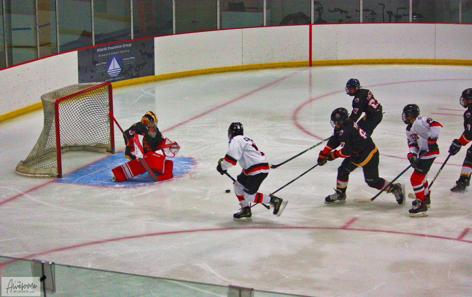 While I was visiting what was the western frontier back in 1704, the 2010 Flames were battling another Islanders Hockey Club at West Side Arena in Manchester, NH. The Flames won the game, 4-2. The home team allowed a power play goal and another goal on a penalty shot. The 2010 Flames took a 3-0 lead, then scored late in the game to win, 4-2. They scored one of their goals on the power play as well. It went something like this. No parents were instrumental in these plays, it’s all about the kids and making good hockey plays.