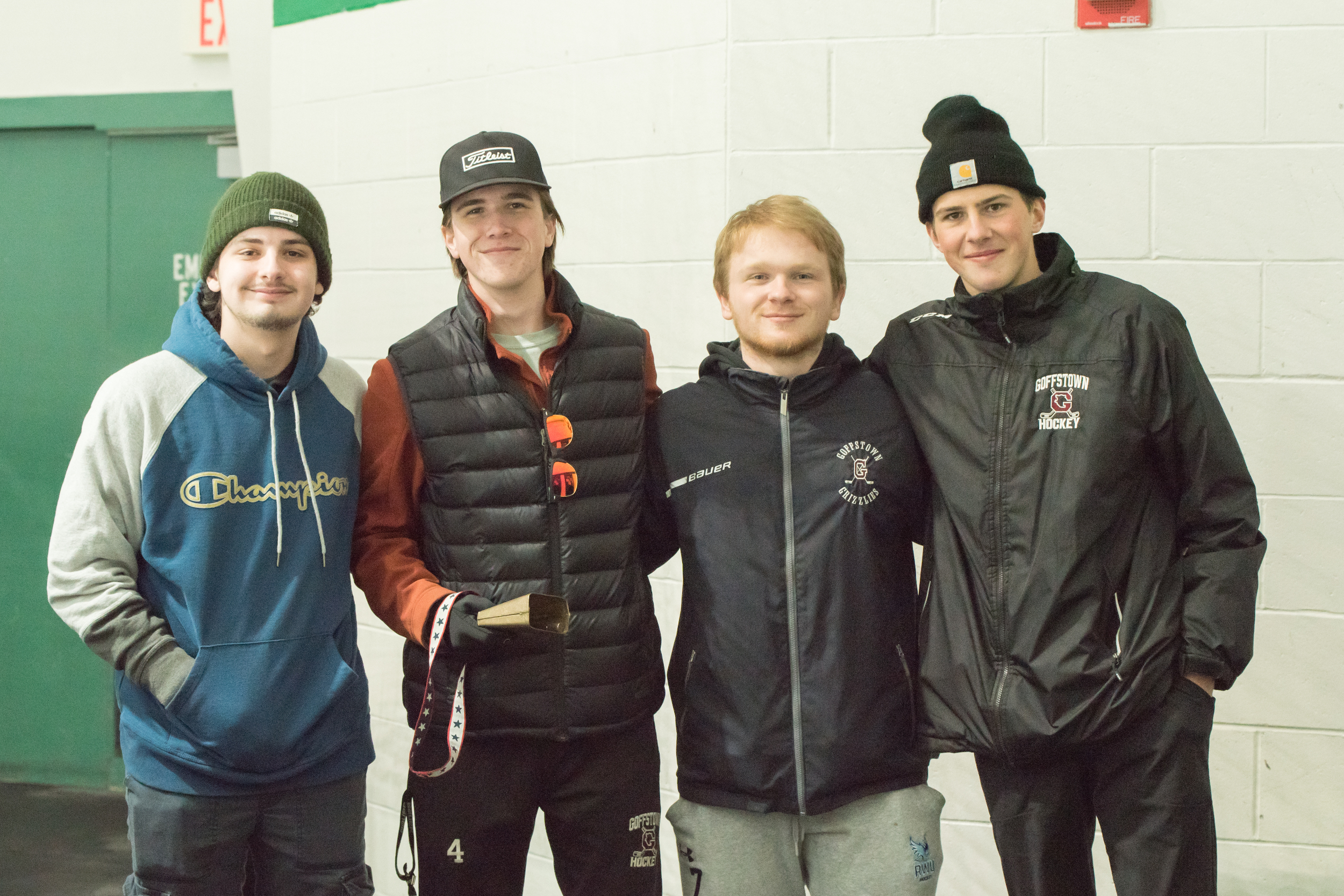Portsmouth-Newmarket came out in the OT and went to work, firing everything at the net with 18 shots on goal. Goffstown managed 8 shots on goal themselves. Make no mistake, both teams had chances to score. Great chances. Both fan bases had good reason to be on the edge of their seats. As time wound down and it looked like the game just might go to a second OT, another senior season was pushed to the next game. After a thrilling near miss for the Grizzlies at one end of the ice, Jake Webber made a save at the other end to force a face-ff with 0:32.2 left in OT. Finn Bussiere won the offensive zone face-off to Caleb Pendleton who raced to Gretzky’s Office behind the Goffstown net. As he skated with the puck he flipped a backhand pass out to the slot where Luke Suhesky had glided in from his left-wing stance on the right-wing face-off circle. Suhesky fought the traffic and a scrambling Webber to push the game-winning goal into the the net with 0:25.9 seconds left to play. What a game! A thriller, no question about it.