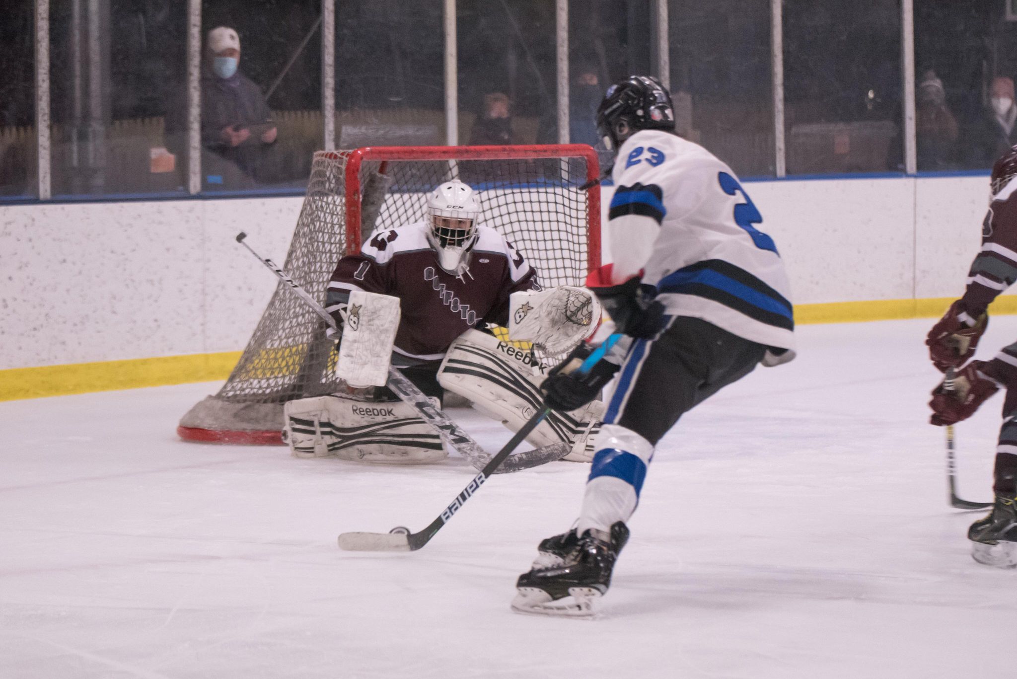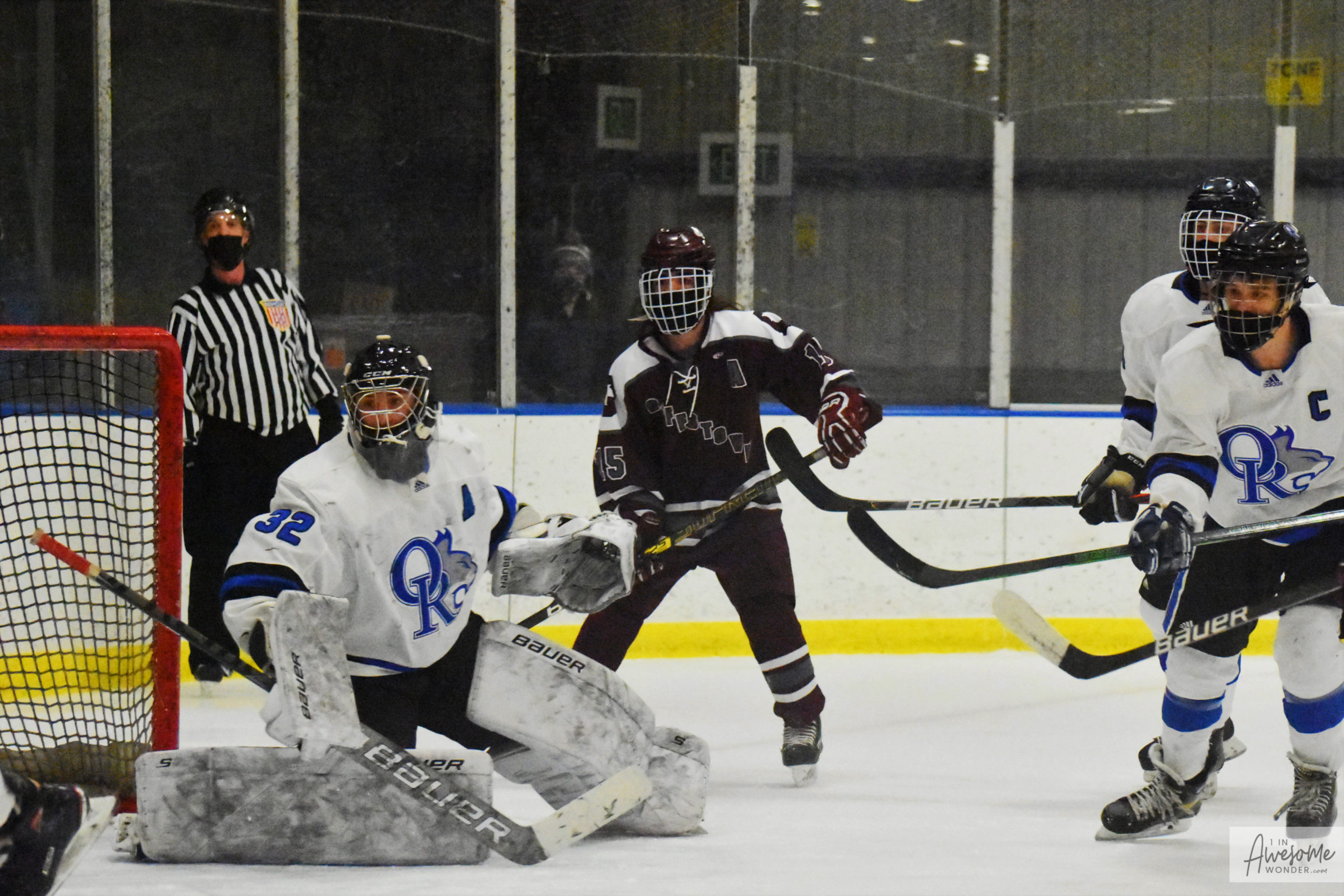 Oyster River had to feel good about themselves, scoring on the first shift of the game. Though, I was a bit worried when the scorer’s booth could not stop the clock after the goal was scored. It was probably frozen in ‘run clock’ mode. They got it figured out eventually. Maybe with a heater. Either way, Oyster River scored just 33 seconds into the game when Corum Nichols scored after a sequence of passes from John Kell and Michael Szymanski. It was classic Oyster River hockey, a little cycle, pass, pass to the slot, shot, goal. The Bobcats had the lead very early.