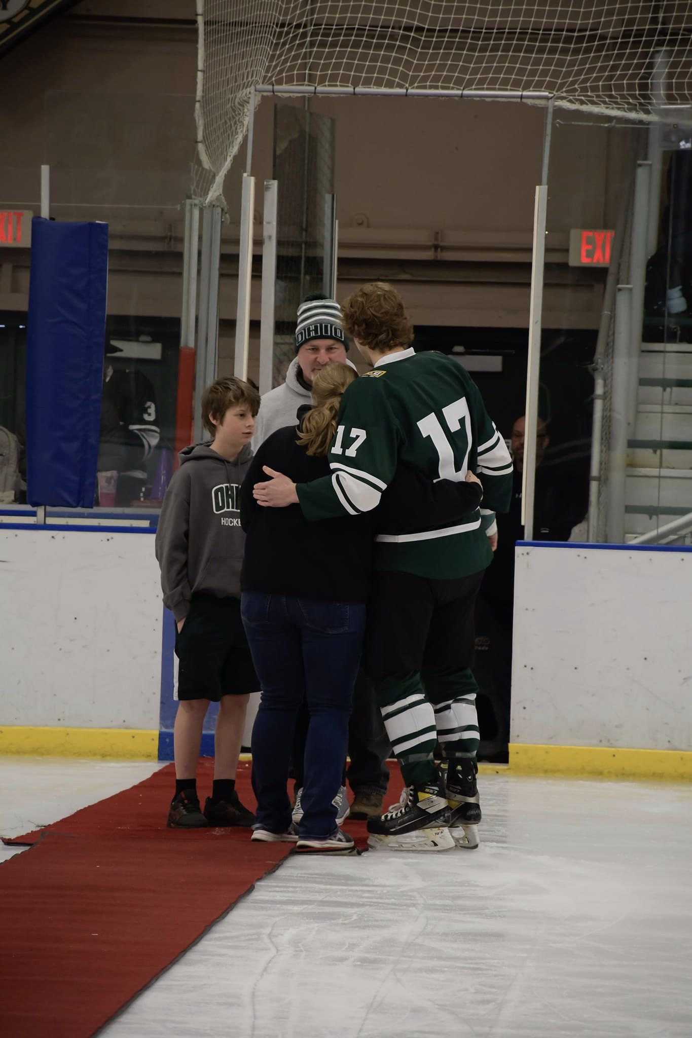The pregame ceremony at Bird Arena on the Ohio U. campus was very nice. We got to go out on the red carpet with the other senior players and their families. It was great. I stood there not quite believing that the early morning practices at Hemenway Rink and then skating for the Dunkin Donuts Muffins and all the years in between had flown by already. His 17th season of hockey was coming to an end.