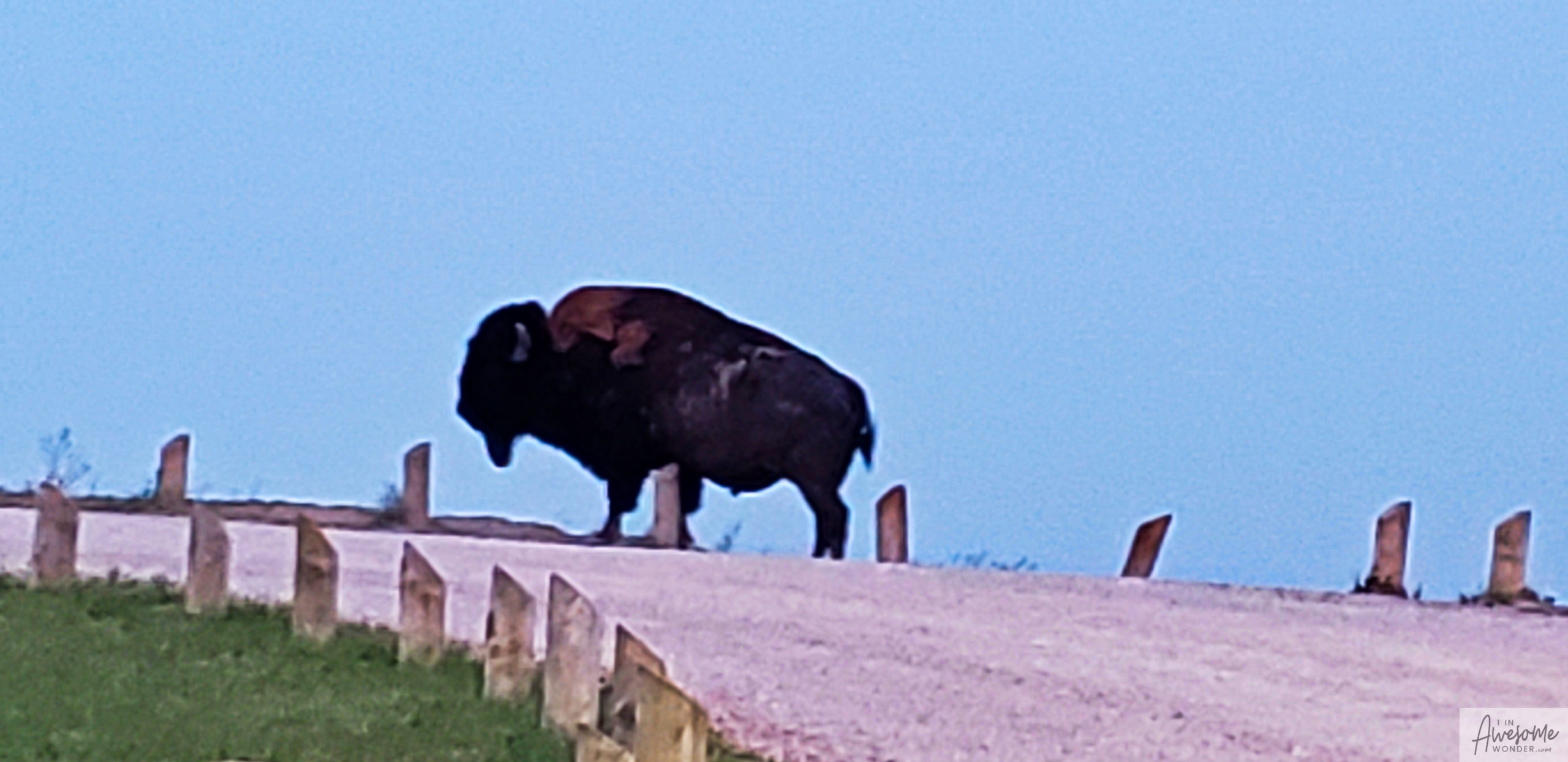 On my last evening, on my last leg of driving through Badlands National Park, I came across this bison. The sky was a bit lighter as I faced west. This massive animal visited several posts, stopping to scratch the underbelly numerous times. I also saw another bison knock one of these deep embedded posts over like it was a candle in a birthday cake. Immense size and power. © 1inawesomewonder 2022.