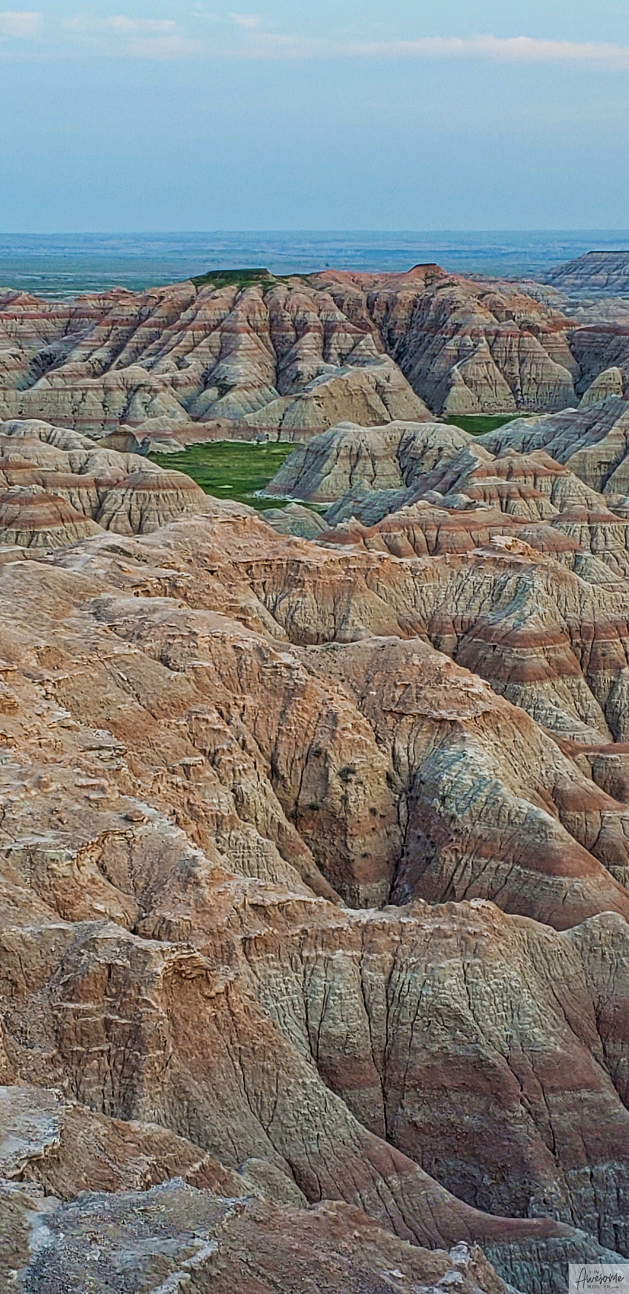 Alright. These two pictures are here for their beauty but also because they are literally across a paved road from each other. This is Burns Basin, looking southwest. I walked out onto the rocks (carefully) along the hint of a short trail. I found a saddle of rock and sat to watch the skies and look at the land. I prayed, and I thanked God for sharing such beauty with me. It was a spectacularly beautiful, quiet place. This place, on that night was all that an evening in Badlands could be. © 1inawesomewonder 2022.