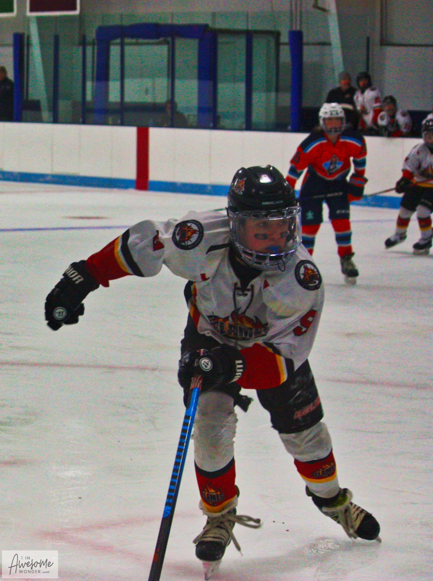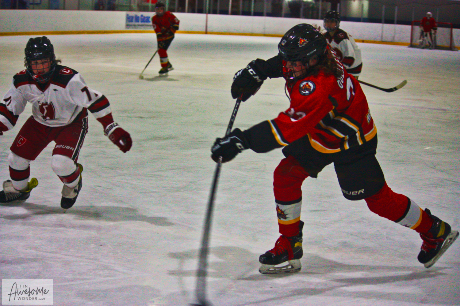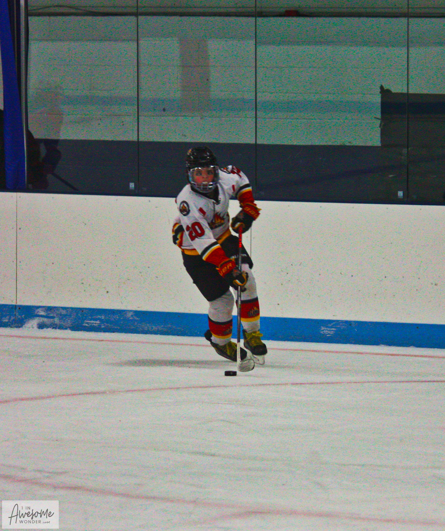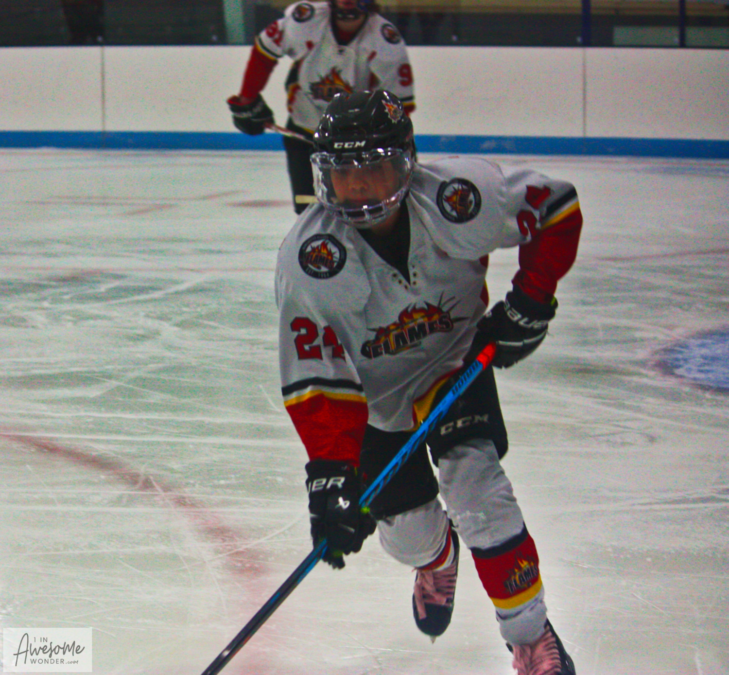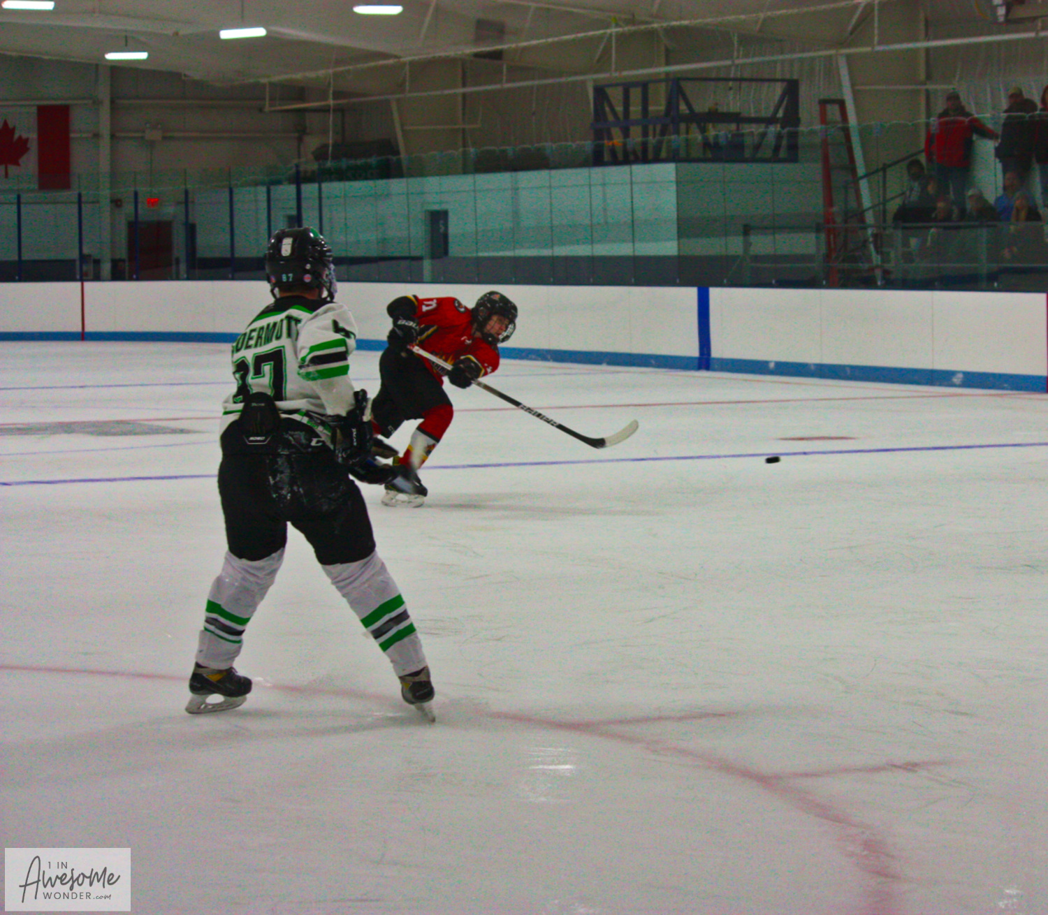 In an example of how quickly things can happen on the ice, the Flames scored first. Lucas Ouellette picked up a loose puck at center ice and changed direction. He skated outside, up the right wing and was cut off by defenders as he turned the corner. Ouellette didn’t panick or force the play, he just calmly banked a pass off of the side boards back to where his defenseman should be. His rush had taken 3 defenders in his wake. Jacob St. Pierre was exactly where he was supposed to be. St. Pierre stepped into the bank pass from Ouellette and blasted a slapper through a defender and the goaltender for the goal. Simple but beautiful. St. Pierre from Ouellette, 1-0.