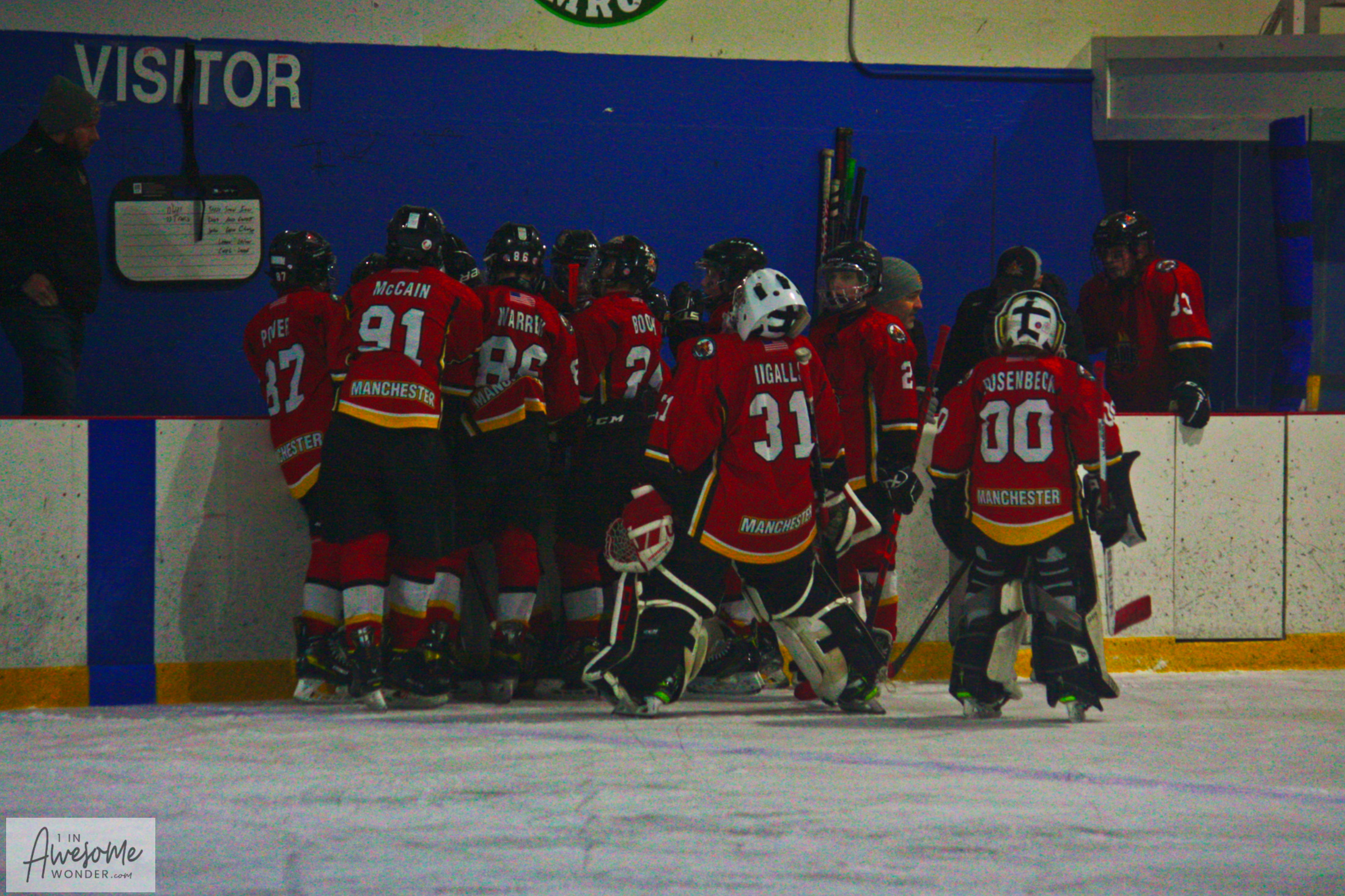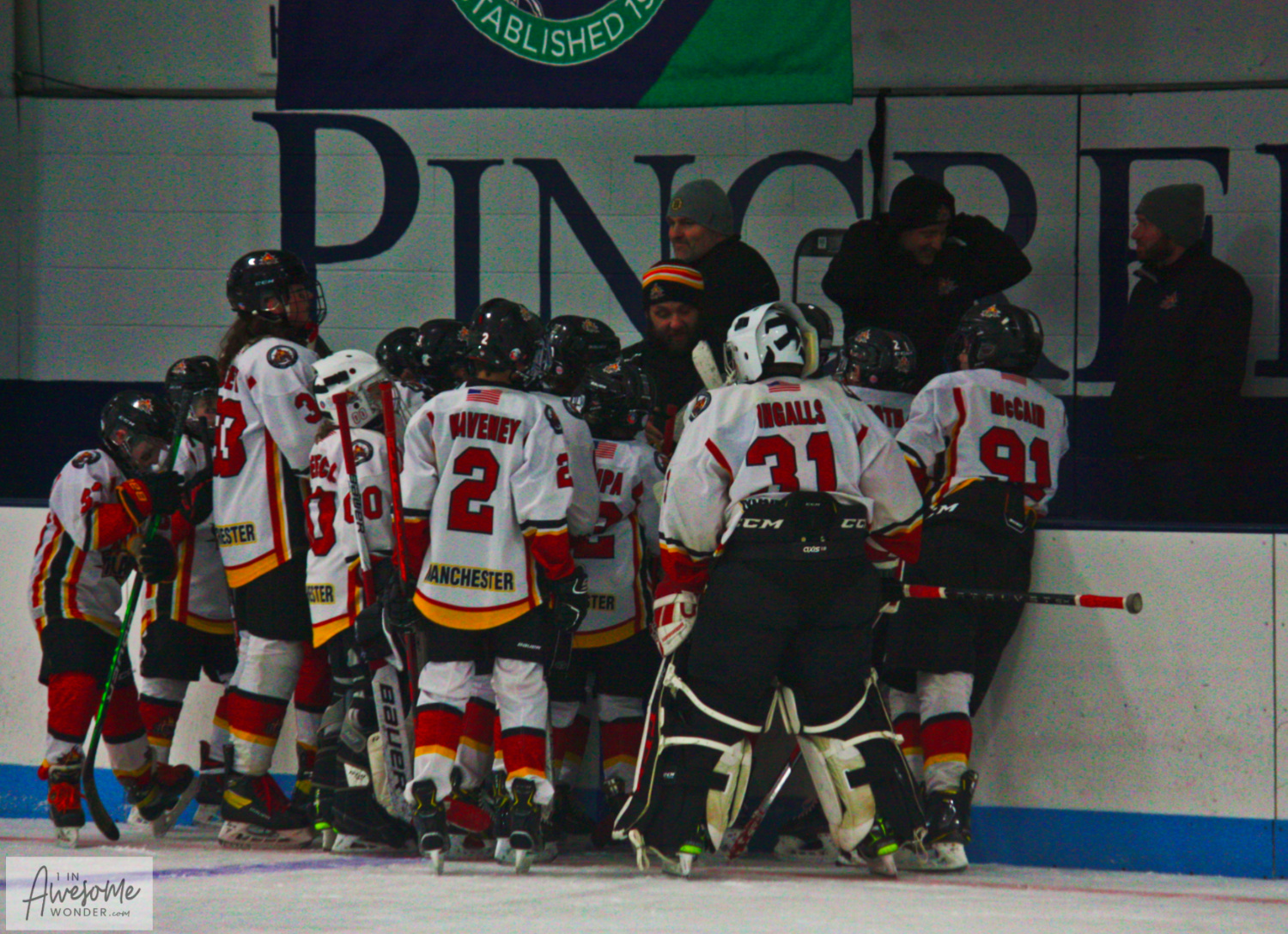 The 2010 Flames surround their coaches during an intermission down at Pingree Rink in the Fed Playoffs.