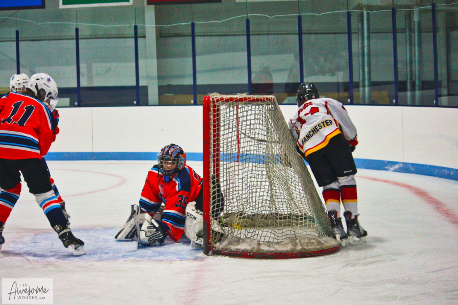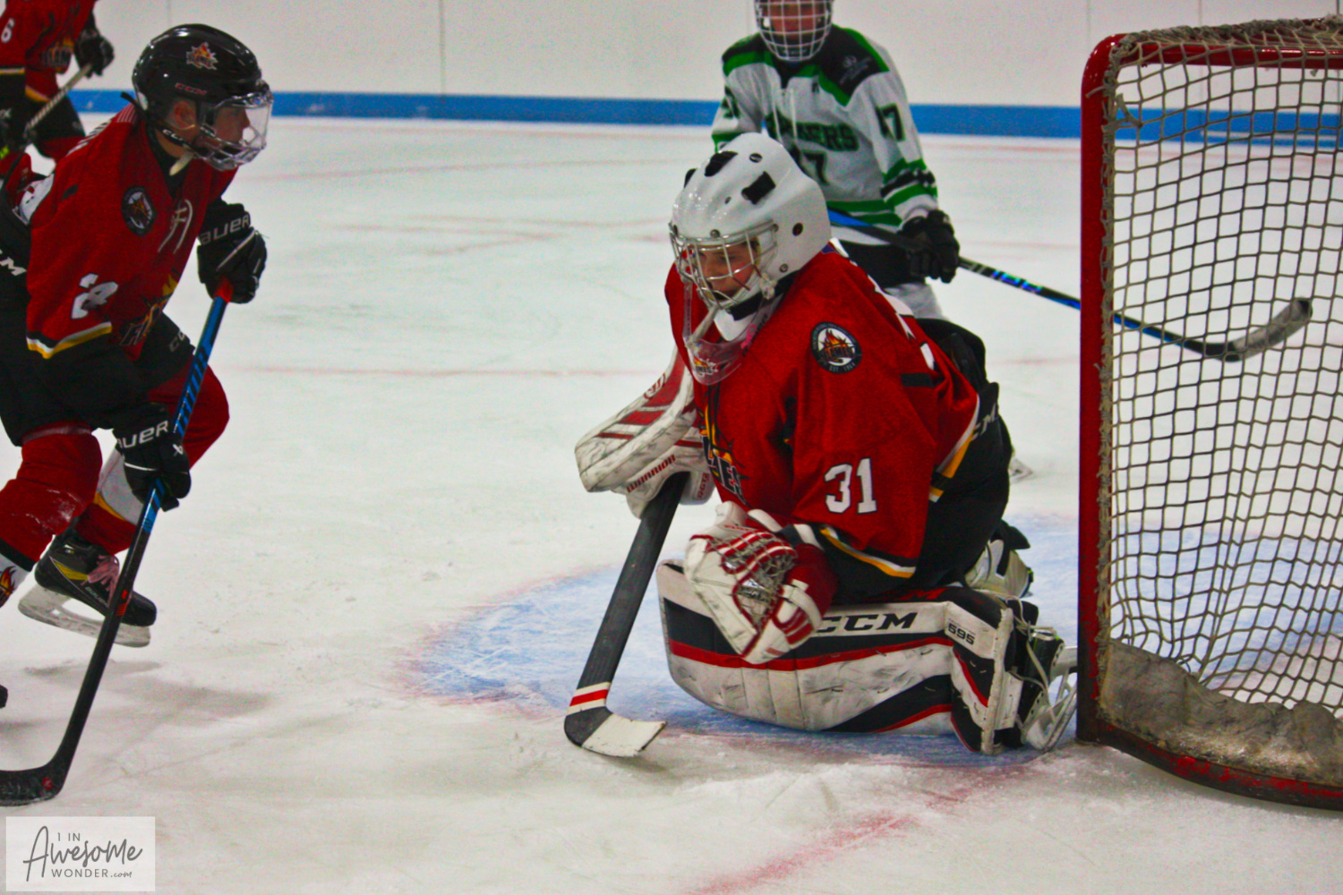 Just the Freight Train. Logan McCain took the puck from behind his own net and skated up the left side. He raced up the ice like one of those annoying ‘digitally enhanced dasherboard ads’ in televised NHL games. I mean, that’s how close to the boards Logan carried the puck. Anyway, he got checked (no call) back at his own blue line but the ‘checker’ bounced off of the Freight Train and stopped spinning and sliding somewhere out at center ice. The Freight Train thundered up the ice and pulverized a shot into the farside top corner for an unassisted goal. 2-1, McCain unassisted.